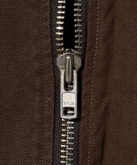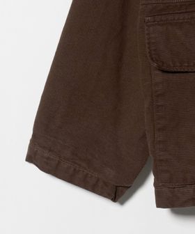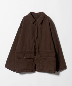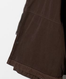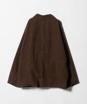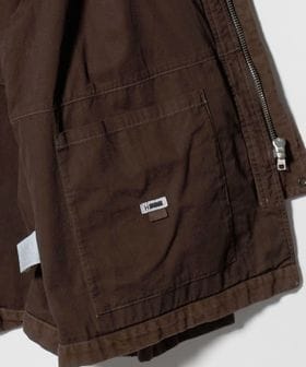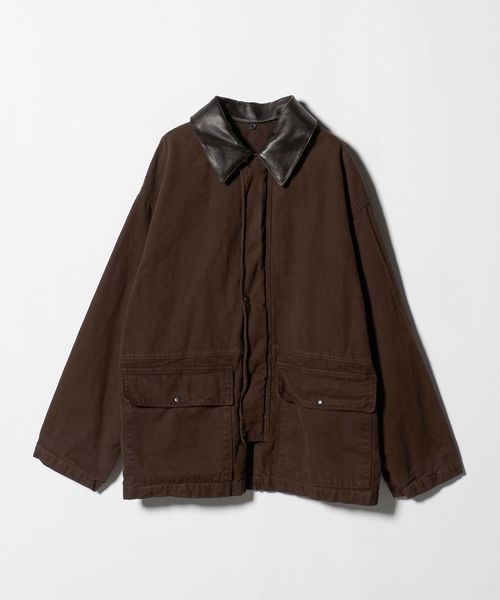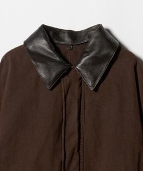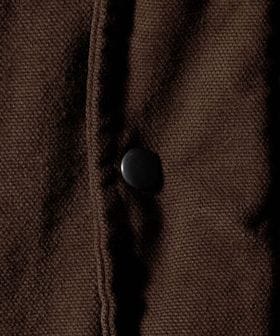 ヨーロッパヴィンテージのハンティングジャケットをベースに、都会的なムードでアレンジしたカバーオールです。高密度のダック生地を使用し、あえてムラの少ない糸で織り上げることでカジュアル感を和らげながら、ポケット形状などのディテールは直線的に作ることで、ワーク感の薄れたモードな印象に。ブラウンに染めた後にブラックの顔料をのせ、洗いをかけることで、顔料が退色しヴィンテージのような表情に仕上がっています。ステッチカラーもあえて微配色に設定し、さりげなくも奥行を引き立てる豊かな表情を演出。オーバーサイズのボディに、取り外し可能な襟はシープレザーを贅沢に使用し、着映えと着回しを両立する万能なアイテム。重厚感のある佇まいが特別なムードを醸し出し、見た目に反した軽やかな着心地が、気負わず袖を通せるオールマイティーな一着。