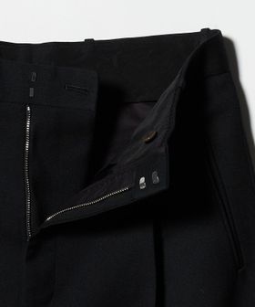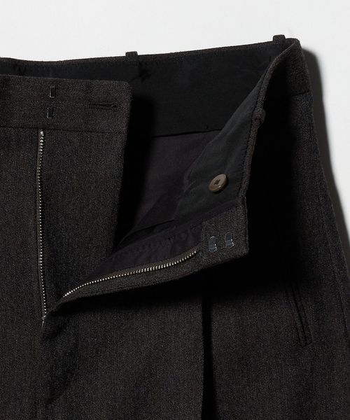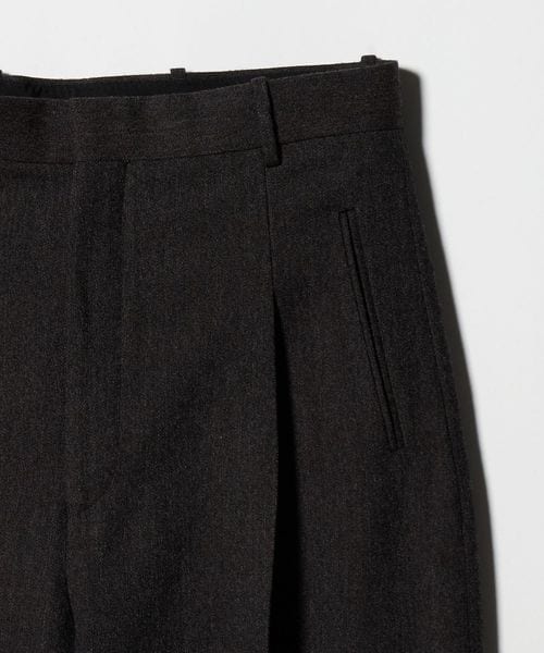 迫力のある太さが特徴の1プリーツワイドパンツです。ブラックは、上質な細番手の糸を高密度の綾二重織に織った贅沢な生地を用いて、仕上げ工程で表面を強く抑えてハリを出しました。厚みとハリがあることで、モードな印象に。ダークグレーは、撚り杢の梳毛糸を使用して高密度に織り上げたフランネルを使用し、グレーとブラウンがミックスした撚り杢による陰影のある表情が特徴です。贅沢な分量感がトレンドのショートアウターとも相性がよく、日常の装いにさりげない個性をプラスします。