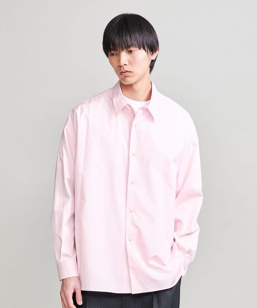 身幅と袖幅にゆとりを持たせた、スクエアテールのレギュラーカラーシャツです。ライトピンクは、イギリスの老舗シャツ生地メーカー「THOMAS MASON」社の上質で繊細な120/2ブロードを使用した、光沢としなやかな張りが魅力。ライトブルーは、イタリアの老舗シャツ生地メーカー「BORGHI」社の高密度120/2ブロードを使用し、ライトピンクよりも厚みと張りのある風合いが特徴です。襟元のデザインは、台襟と羽襟が切り替えられていないワンピースカラーで、折り返した際に柔らかい表情が生まれ、レディースのブラウスのような色気のあるムードを感じられます。上質な作りにこだわりながら、アーバンムード漂うリラクシーなシルエットが日常のワードローブを盛り上げてくれます。