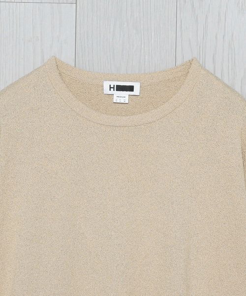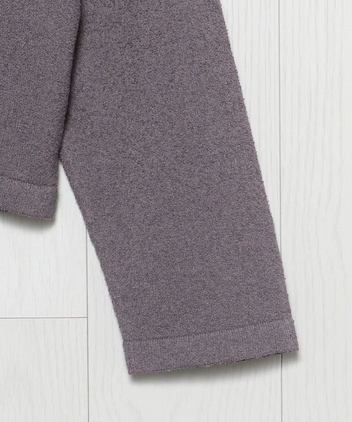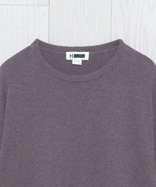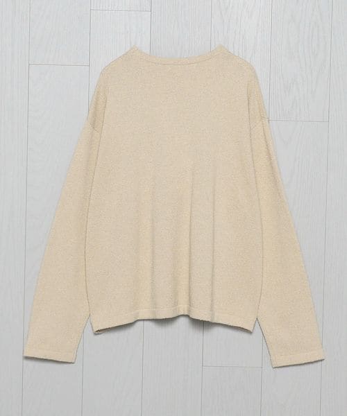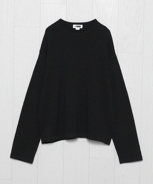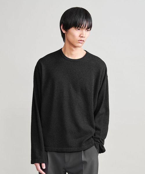 独特の凹凸形状のあるブークレ糸を採用し、度詰めで編み上げたクルーネックニットです。丁寧に編み上げたニット生地を使用したニットソー仕立てで、日常使いのしやすさに加え、ご自宅で洗える手軽さも魅力です。シルエットは、ワイドな身幅にすっきりとした短めの着丈、手の甲が隠れる位の長めの袖丈に設定しました。固すぎない生地感は身体を通すことで独特の揺れ感が生まれ、きれいめなパンツや合繊素材のボトムとも好相性です。表情のあるドライなタッチと豊かな風合いで着心地もよく、春先のワードローブを盛り上げてくれます。
