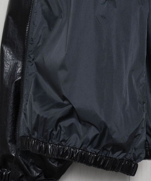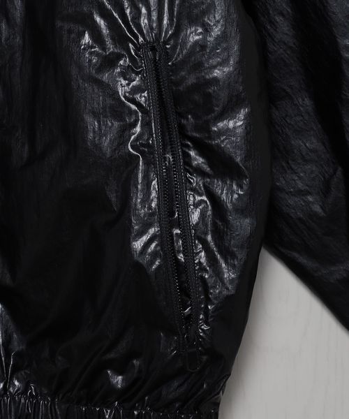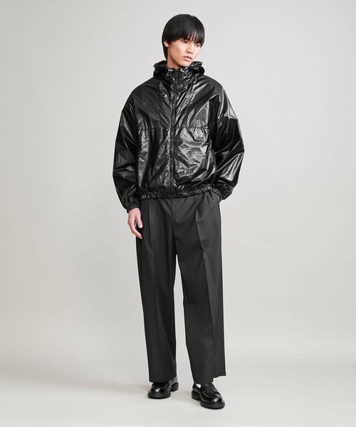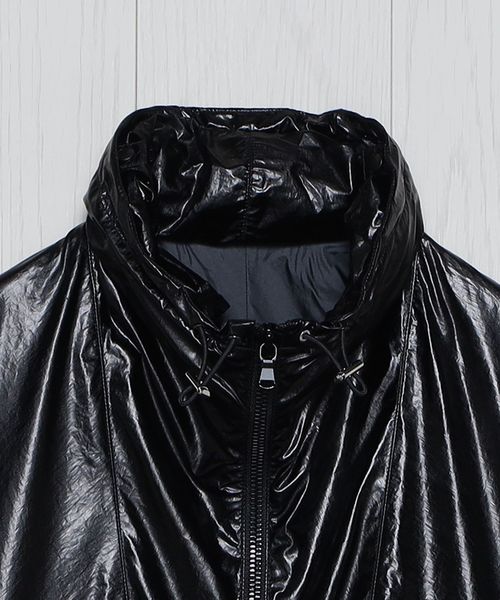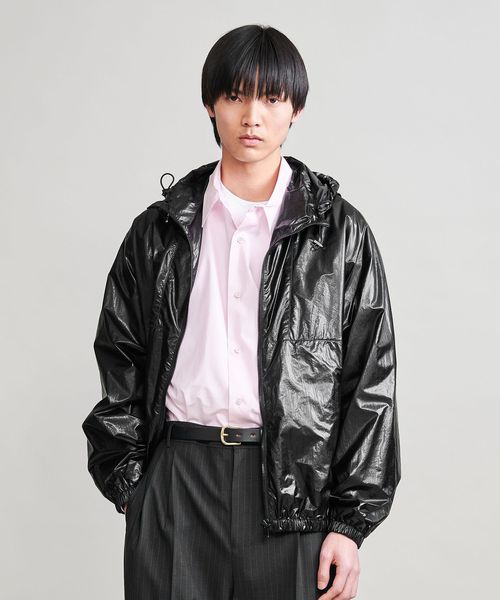 90年代のアノラックジャケットをベースに、シャイニーな光沢を纏ったバランスが新鮮なブルゾンです。高密度に織られたナイロンタフタの表面に特殊エナメルコーティングを施した生地を使用しています。綺麗な光沢がありながらも、小皺が生まれ独特の表情を演出。レングスは短めにコンパクトなバランスで設定しつつ、袖幅はややゆとりを持たせたスタイリッシュなシルエットが特徴です。フードは丸めて内側のストラップで留めて収納ができ、スタンドネックとしても楽しめます。金具のファスナーを用いることで重厚感を生み出し、合繊特有のスポーティな雰囲気を払拭したレザーライクな佇まいがファッションムードを高めてくれます。他に無い独特のオーラが存在感を放ち、コーディネートの主役になるアイコニックな一着。