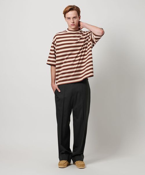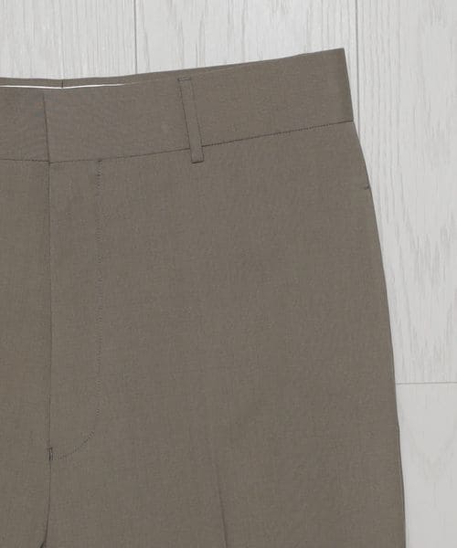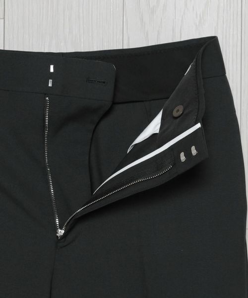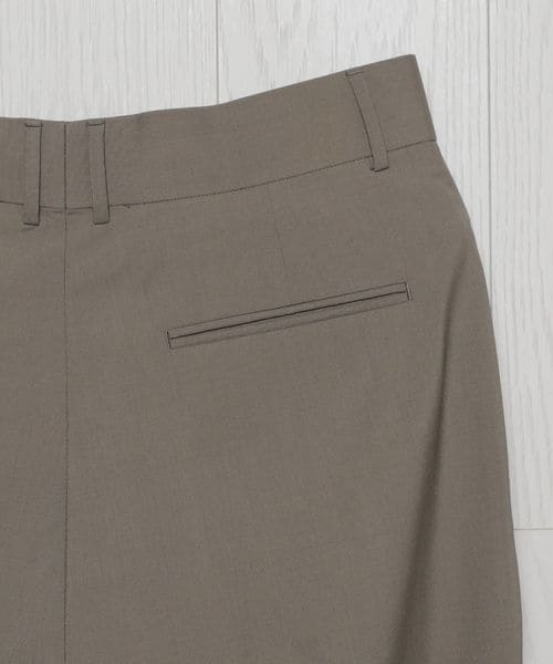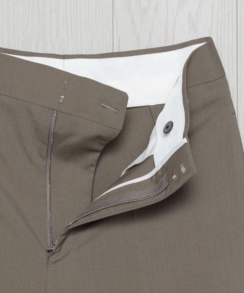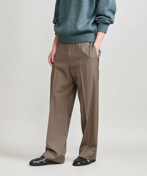 僅かにフレアに感じる絶妙なシルエットにこだわったワイドパンツです。細番手の梳毛糸を用いて高密度に織り上げたトロピカルクロスを使用しています。上質原料による表面の光沢が、さりげなくも洗練されたムードを演出。薄手でありながら高密度による張り感がラインを綺麗に魅せ、肌離れのよいタッチで春夏シーズンを通してご活躍いただけます。裾にクッションができたときのニュアンスが心地よく、クラス感あふれるアーバンスタイルに導くおすすめの一着。