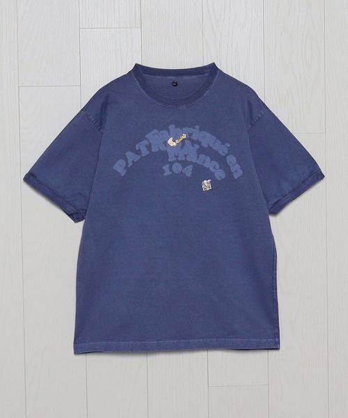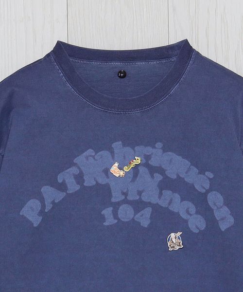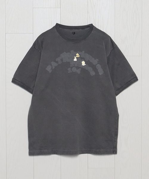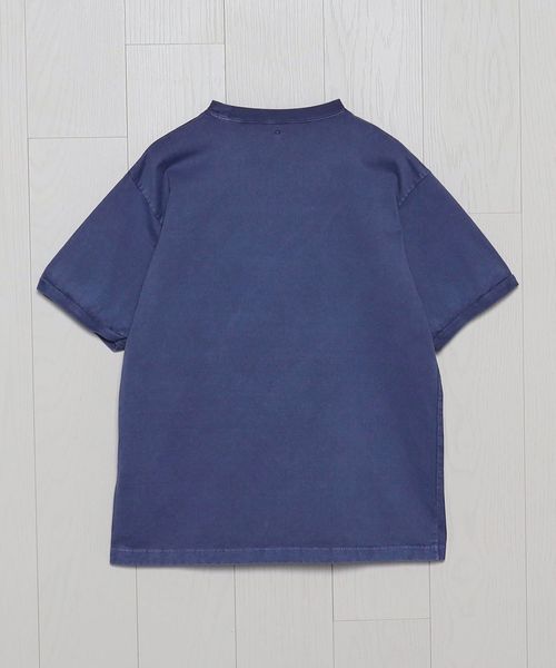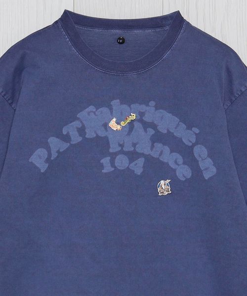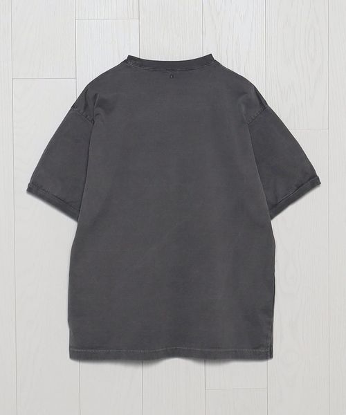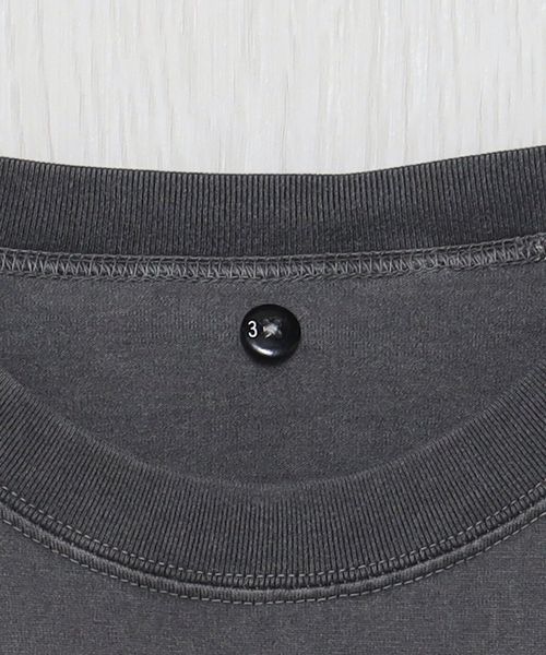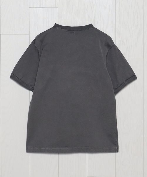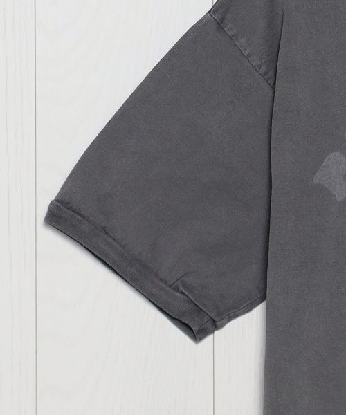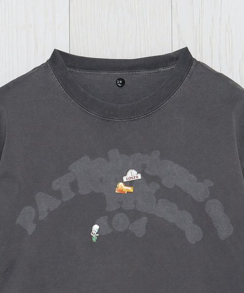 インラインで展開しているフェルトワッペン付きTシャツをベースに、別注オーダーで特別に作成しました。製品染めのボディに、ワッペンを外したような色抜けの文字跡を特殊な加工技術で再現。そこに、既存モデルにも付いているヴィンテージのピンバッジを組み合わせています。力の抜けた遊び心あふれるデザインが、個々のスタイルを豊かに彩ります。