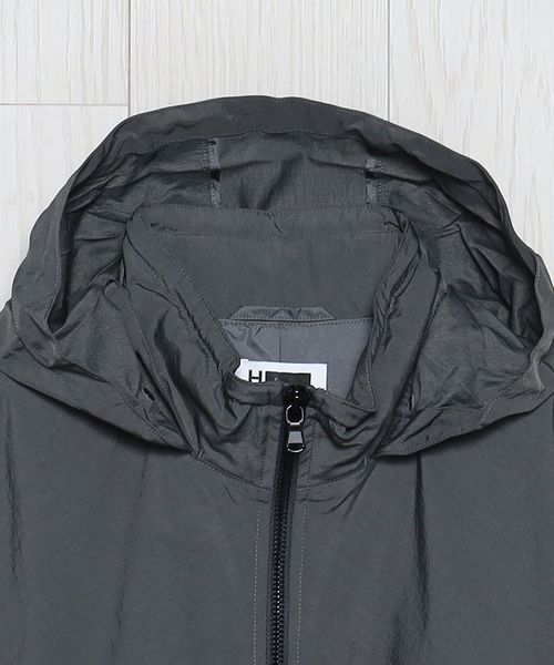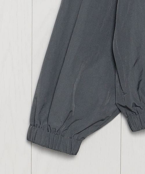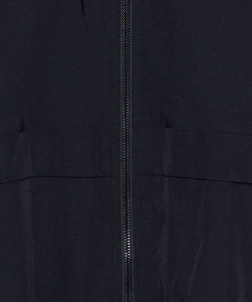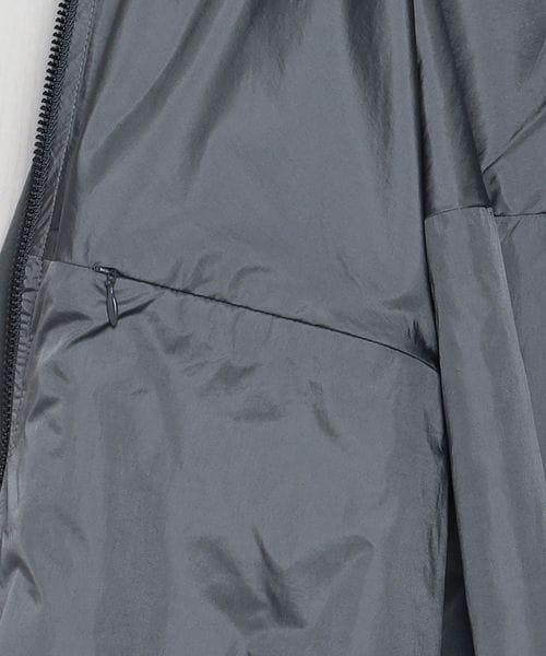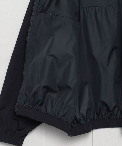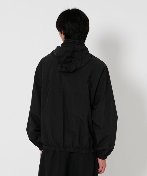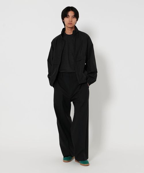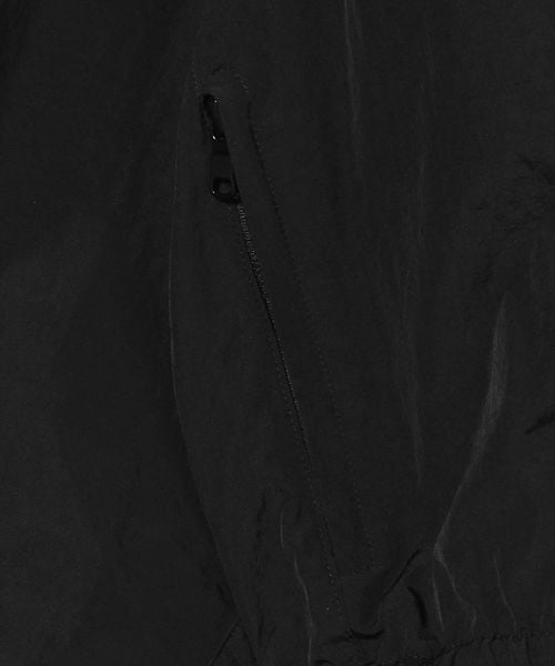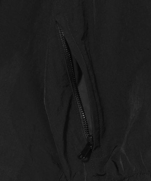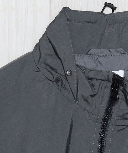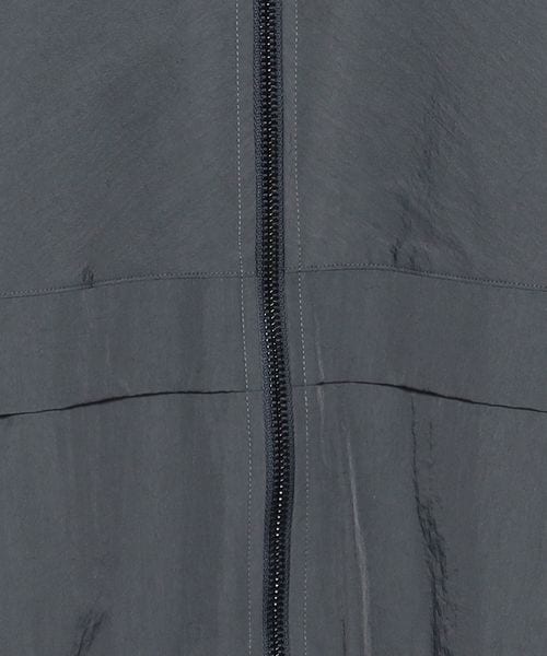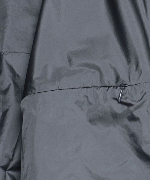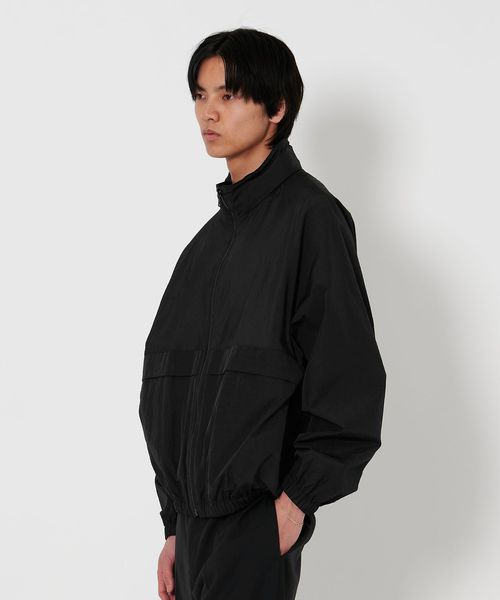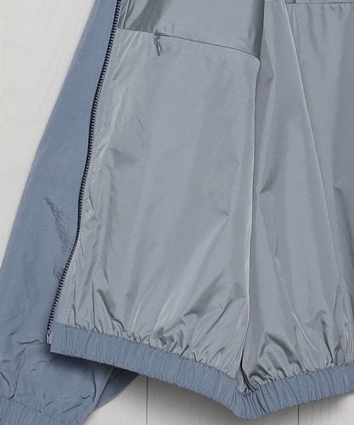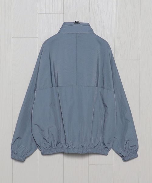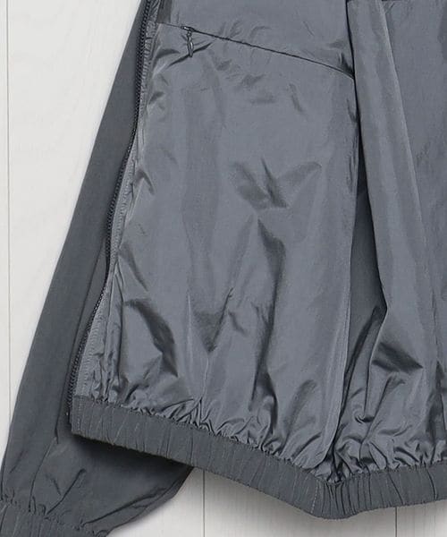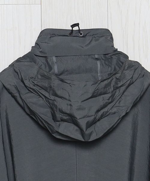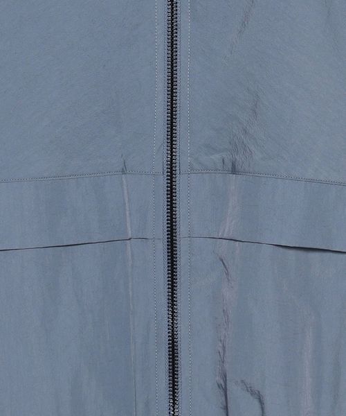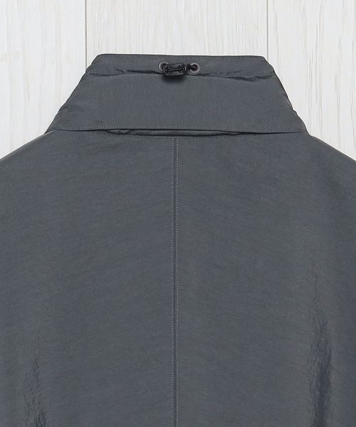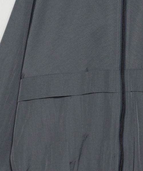90年代のスポーティーなジップジャケットをべースにアレンジしたスタンドカラーブルゾンです。イタリアの生地メーカー「OLMETEX」社のナイロンカルゼを使用し、特殊ワッシャー加工とPUコーティングを施すことにより、ナチュラルな表面感に加え、モードな張りと光沢が活かされた一着。ワイドな身幅に、すっきりとした着丈、絞りを加えた裾と袖口が丸みのあるシルエットを生み出しながら、ダイナミックなドルマンスリーブがファッションムードを高めてくれます。襟は抜け感を持たせて低めに設定し、ネック後ろに付けたスピンドルで襟口を絞ったり、収納されたフードを出して楽しむのもおすすめ。ヨーク風に仕上げたシャープな切替線が90年代を彷彿とさせるスタイリッシュなアクセントをプラスします。表側にはサイドシームポケット、内側にはジップポケットを2つ備え、使い勝手にも配慮した機能的なデザイン。適度なウェイトがありつつも清涼感のある風合いが端境期のアウターコーディネートを盛り上げてくれます。定番のブラックに、レトロスポーツ感のあるミディアムグレーとライトブルーをご用意しました。