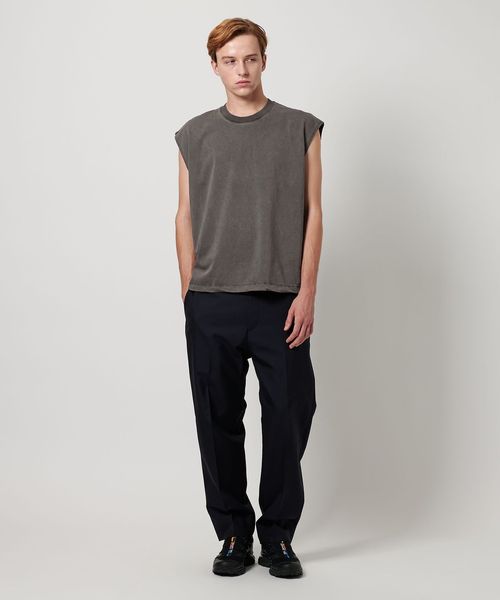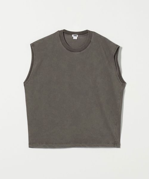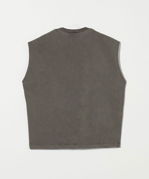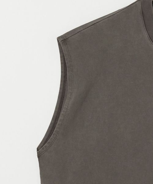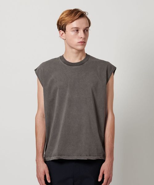 一枚で決まるバランスにこだわったノースリーブカットソーです。軽めのドロップショルダー、リブの無いアームホール、ほどよくゆとりのあるシルエットが特徴のデザイン。度詰めで編み立て、しっかりとした張りのある生地感に仕上げたコットン天竺を採用しています。クリーンな表情のブラックとホワイトに加え、ダークグレーはピグメント加工を施し、古着のようなフェード感のあるカラーリングに。過度な露出を控えつつも、ノースリーブならではの軽快さを備えた新鮮なバランスが、夏の装いを盛り上げてくれます。シンプルながら計算尽くされた表情が安心感を与え、定番の仲間入りを果たしてくれる万能な一着。