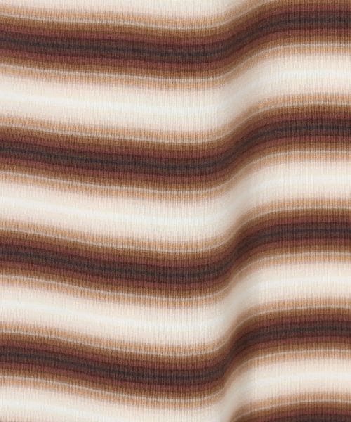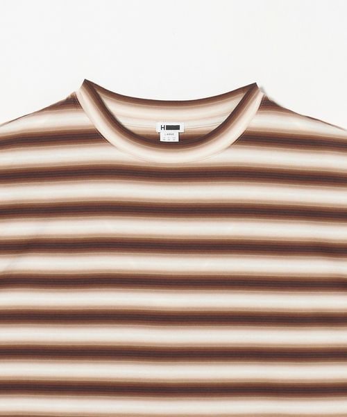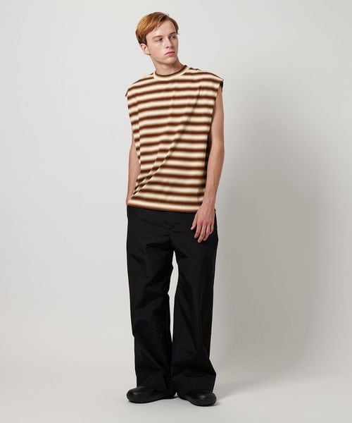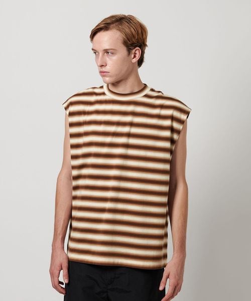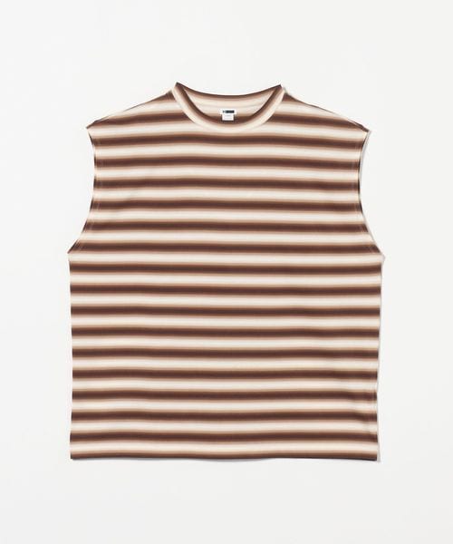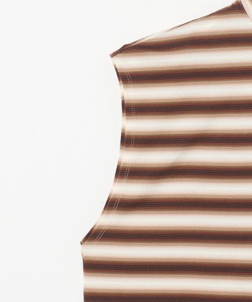 オンブレチェックをデザインソースに、ボーダー柄で表現したノースリーブカットソーです。十数色のニアカラーを使用した、絶妙なグラデーションが目を惹くオンブレボーダー。ベースの生地は度詰めで仕上げ、比較的薄手でやわらかい質感でありながら、透け感も気にならず着応えのあるバランスに。ワイドな身幅に、セミクロップド丈のシルエット、衿ぐりはボディ生地を用いて低めのモックネック風のバランスで設定しました。繊細かつムードのある柄が独特の存在感を放ち、軽快な夏の装いを特別な雰囲気に導きます。