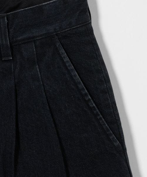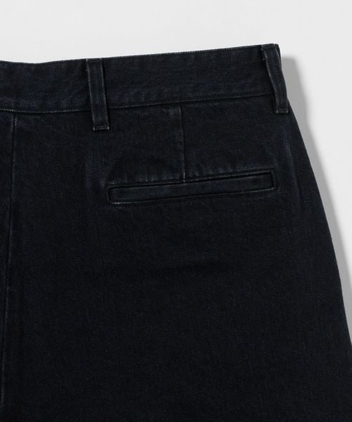ゆったりとしたシルエットが特徴の2プリーツショートパンツです。13.5ozのデニムを使用し、自然なタテ糸ムラの表情がカジュアル感を和らげながら、上品な印象に仕上がっています。経糸緯糸ともに硫化染めした糸で織り上げることで、深みのある色落ちが魅力です。ブラックデニムならではの汎用性の高さに加え、丁寧な縫製で仕立てれたミニマルなデザインが、大人のアーバンスタイルに導きます。