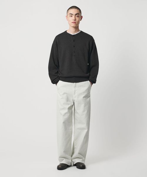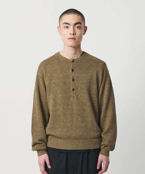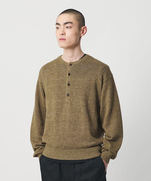 感覚を狭めに配置した4つボタンが特徴のヘンリーネックプルオーバーです。イタリア「Servizi e Seta」社の上質なリネンを採用し、裏側に極細ポリエステルストレッチ糸を編み込むことで、リネン特有のダレやすさに配慮。ゆとりのあるリラクシーなボディに、リブで絞ったバルーンシルエットが心地よいバランスを生み出します。素材がもつ自然な光沢と上質な表情が、魅力をさらに際立たせます。