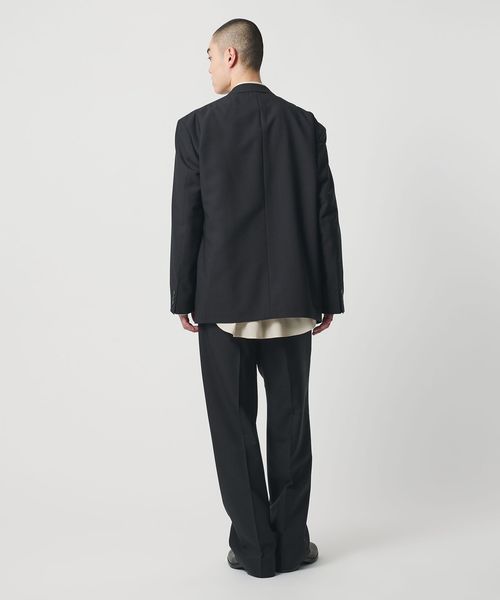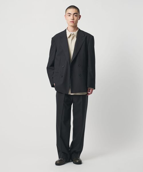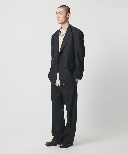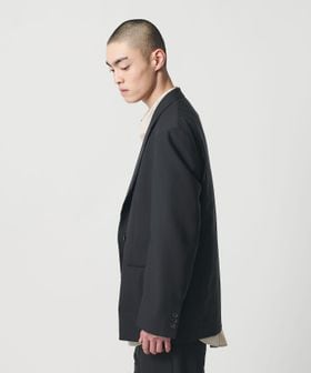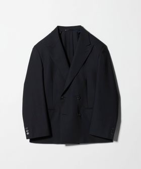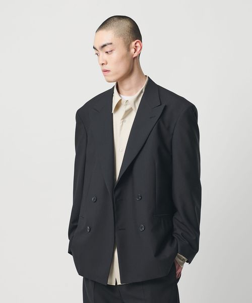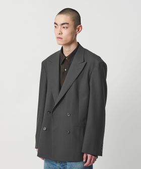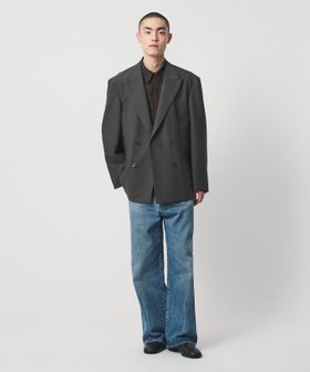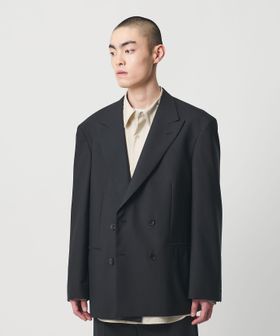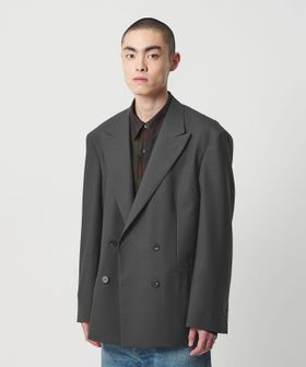 胸箱ポケットを排除し全体的に直線的なラインに仕立てた、4つボタンのダブルブレステッドジャケットです。英国のクラシックなタキシード生地をベースに開発した、梳毛強撚糸とモヘヤ混の糸で織り上げたドスキンクロスを使用しています。上質な素材が活かされた微光沢としなやかな質感がラグジュアリーな雰囲気を演出。やや肩を落としたドロップショルダー、太めのスリーブが、迫力のあるシルエットを描き、存在感を際立たせます。縁が細いオリジナルホーンボタンを採用し、袖口のボタンは一般的なサイズよりやや大きく、静かながら主張を感じられるデザイン。シンプルながら、計算尽くされた佇まいがモードな印象を与え、まとうだけでファッションムードを高めてくれます。