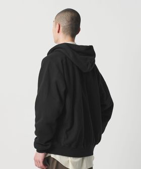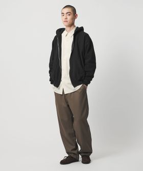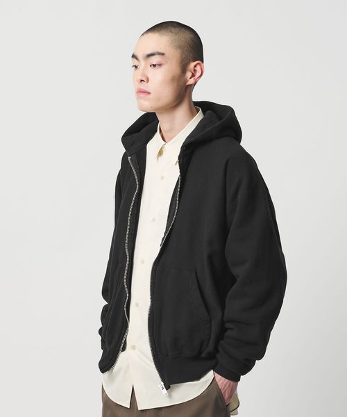 クラシックな雰囲気で仕上げたスウェットジップフーディです。タンブラー乾燥を繰り返したかのような、脱脂感のあるドライな質感と波打ったフロントファスナーが特徴です。さらに、クラシックなボディに敢えて光沢感の強いファスナーを合わせることで、モダンな印象を演出。ワイドな身幅に、すっきりとしたレングスで仕立てた、ブルゾンのような重厚感のある雰囲気がファッションムードを高めてくれます。ヴィンテージスウェットを彷彿とさせる繊細な表情が、まとうだけで高揚感を与えるおすすめの一着。