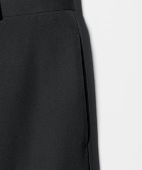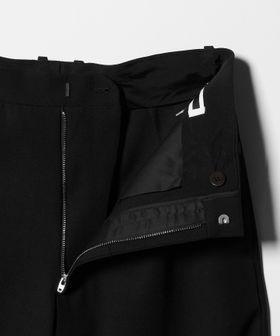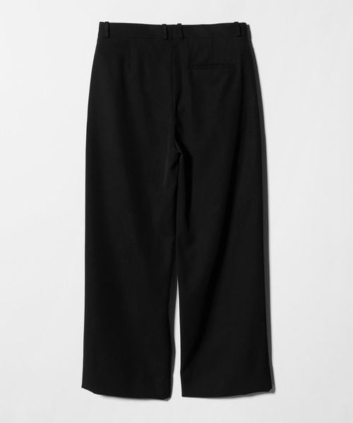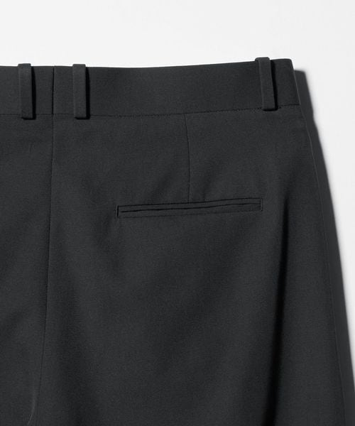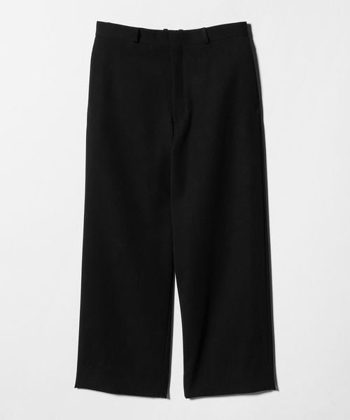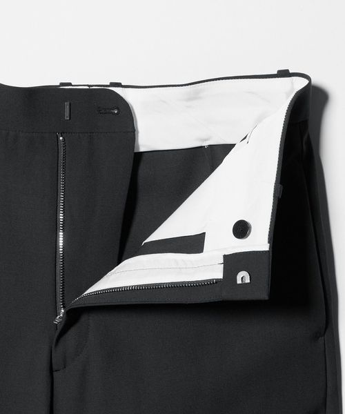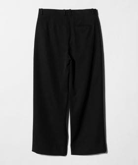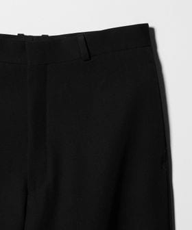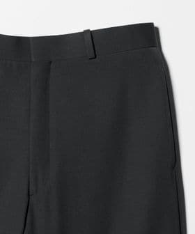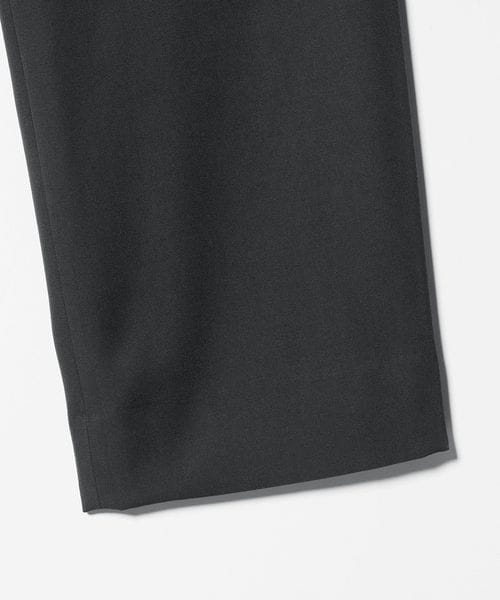 ノープリーツで仕上げた、シンプルなワイドストレートパンツです。ふくらはぎから裾にかけて僅かにテーパードさせることで、ほどよいゆとりを保ちながら裾幅が広すぎない上品なラインに。シューズとのバランスもとりやすく、大人が取り入れやすいシルエットが魅力です。上質な梳毛糸を高密度で織り上げたギャバジンを使用し、オフスケール+含浸加工を施すことで、ウールの表面の毛羽を排除したクリアな表面感が特徴です。コンフォータブルなデザインが日常使いしやすく、共生地ジャケットとのセットアップスタイルもおすすめです。