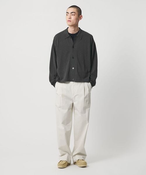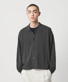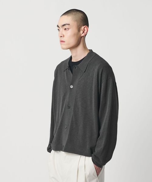 リブレスデザインのプレーンなニットシャツです。コットン×ナイロン×麻をブレンドした、程よい肉感と清涼感のある風合いが特徴です。スラブ形状の糸を使用し、リラックス感のある表情が存在感を際立たせています。着丈を短めにすることにより、Gジャン感覚で着られる軽快なシルエットに仕上げました。肘下の一から袖にかけてテーパードを強めることにより、やや窄まった袖口設定に。袖に軽くクッションをつけてニュアンスをつけたり、釦を開けてラフに着るスタイルも様になります。