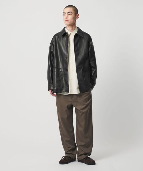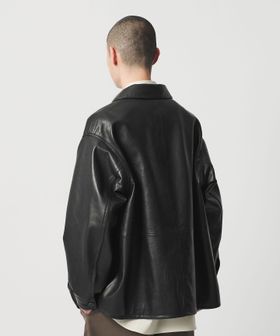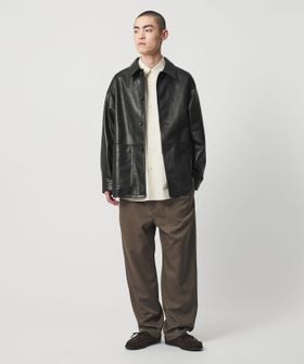 滑らかなシープレザーと、大きく象ったパッチポケットが特徴のカバーオールです。天然の渋で鞣し、染色も水染めで仕上げることによって皮本来の表情を活かしました。靴用の皮を仕上げるときに行う鞣し工程をすることで、独特のハリ感が出ているのも特徴です。革の質感が際立つように、デザインは極力シンプルに、装飾には上品なホーンボタンを採用。ほどよくゆとりのあるシルエットに、コンパクトな襟が軽快な印象を添え、アーバンムード漂う洗練された大人のカジュアルスタイルを演出します。