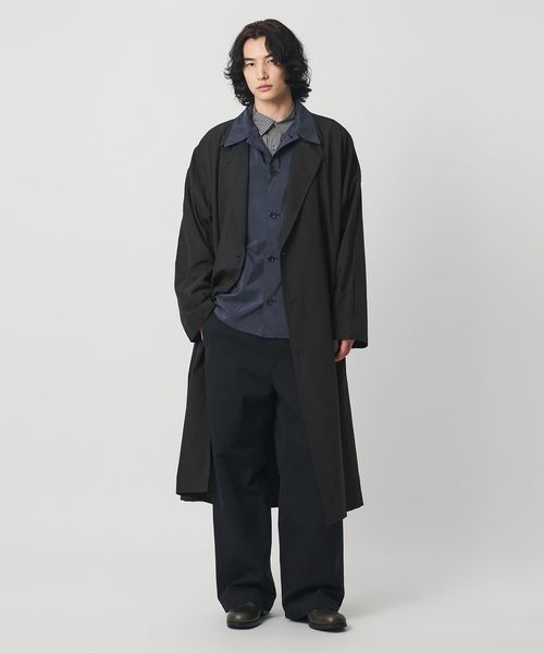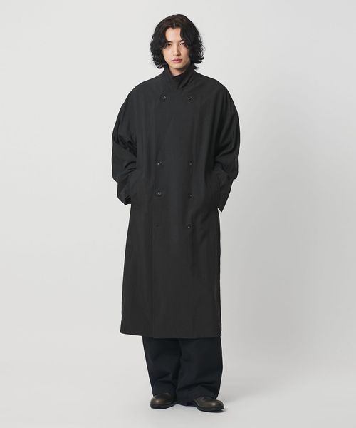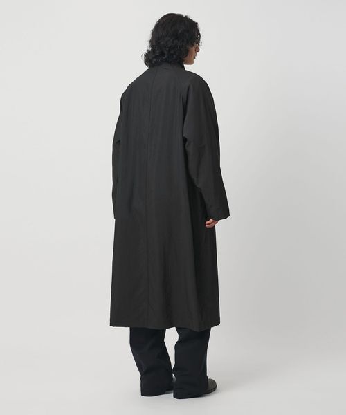 ややゆとりを持たせたIラインのマキシレングスが魅力のダブルブレストコートです。身頃と袖を一枚で構成した変形スリーブを採用し、リラックス感を強調した色気のあるデザイン。素材には、シルクスパンとナイロンを交織した高密度ハイカウントタフタを使用。特殊な液流染の後にタンブラーワッシャー加工を施すことで、擦れによる微起毛と自然なシワ感を生み出し、着古したような表情に仕上げました。着映えのする重厚な佇まいがファッションムードを高めながら、軽やかな着心地が気負わず袖を通せる万能な一着。