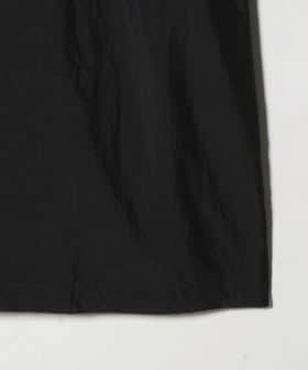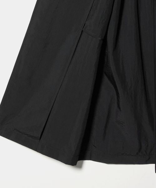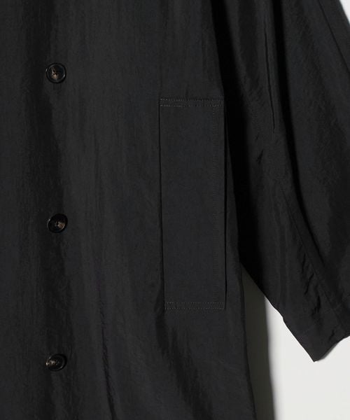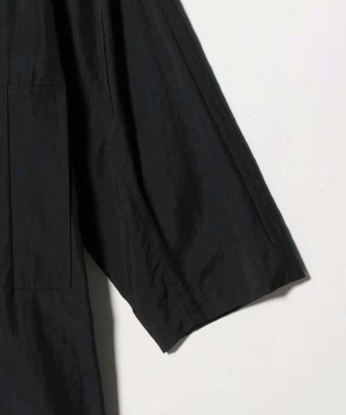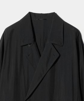 ややゆとりを持たせたIラインのマキシレングスが魅力のダブルブレストコートです。身頃と袖を一枚で構成した変形スリーブを採用し、リラックス感を強調した色気のあるデザイン。素材には、シルクスパンとナイロンを交織した高密度ハイカウントタフタを使用。特殊な液流染の後にタンブラーワッシャー加工を施すことで、擦れによる微起毛と自然なシワ感を生み出し、着古したような表情に仕上げました。着映えのする重厚な佇まいがファッションムードを高めながら、軽やかな着心地が気負わず袖を通せる万能な一着。