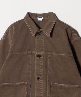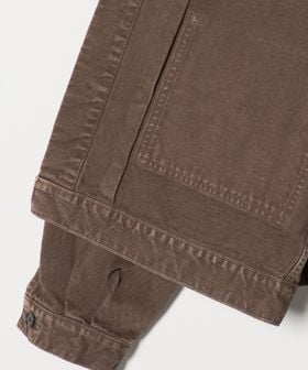 クラシックなGジャンとカバーオールの要素をミックスした、ショートレングスのワークジャケットです。一般的なGジャンほど短すぎない絶妙な着丈に加え、タックによって丸みを帯びたバックシルエットが独特なフォルムを生み出しています。素材には、13.5ozの左綾ヘビーチノを採用。製品染め後に長時間洗いを施すことで深みのある表情に仕上げました。装飾はホーンボタンをあしらい、ボディに馴染みつつ上品な印象をプラス。ワイドな身幅とボリュームのあるスリーブが心地よいバランスに導きながら、土臭さの無い都会的なムードが洗練されたカジュアルスタイルに導きます。