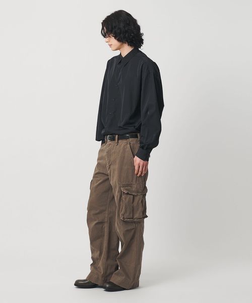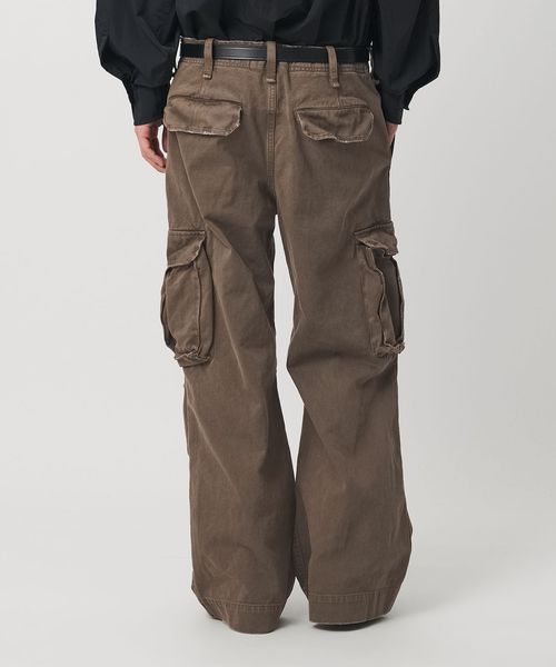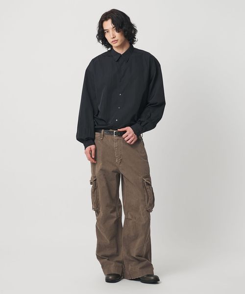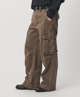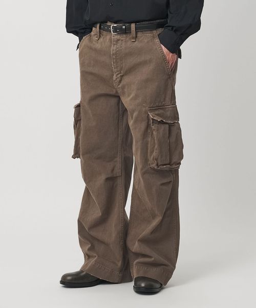 2000年代のアメリカンカーゴパンツをベースに、現代的な気分でアレンジしました。毛羽立ちが少ない美しい綿糸を使用し、高密度に織り上げたハリとコシのあるヘビーチノクロスを採用。製品硫化染めとストーンバイオ加工により、柔らかな風合いにとヴィンテージのような趣のある表情を引き出しています。太幅ループや、三方マチ付きのカーゴポケット、ウエストに通したコットンテープなどの、存在感のあるディテールも魅力。腰回りをすっきりと仕立てた浅めの股上設定に、膝から裾にかけてのラインを強調した大胆なワイドシルエット。カーゴポケットをやや低めに設置することで、印象的なルーズバランスを演出しました。