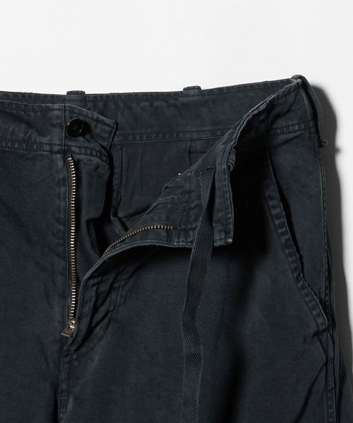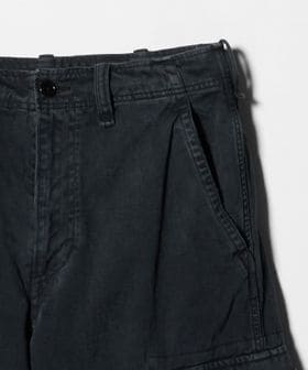 太幅ベルトループや三方マチ付きのカーゴポケット、ウエストに通したコットンテープなどの、存在感のあるディテールも魅力。