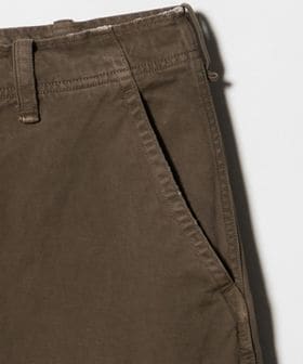 毛羽立ちが少ない美しい綿糸を使用し、高密度に織り上げたハリとコシのあるヘビーチノクロスを採用。