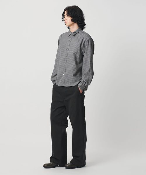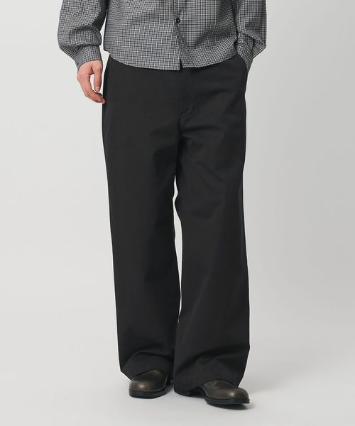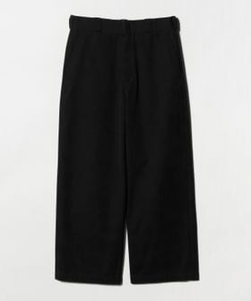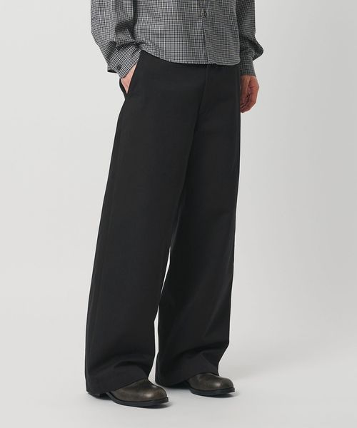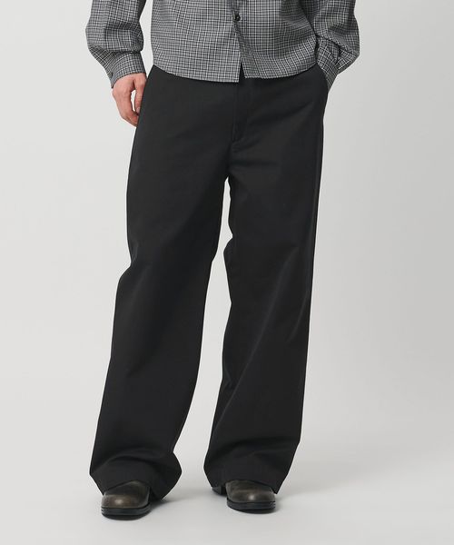アメリカのヴィンテージワークパンツをベースに再構築した一本。経糸には80番手の上質なコットンを三子撚りした糸を、緯糸には梳毛糸を用い、高密度に織り上げたギャバジンクロスを採用しています。ウールの上品さとコットンのカジュアルな風合いを併せ持った万能な生地感が魅力です。太めのベルトループがワーク由来のエッジを添えつつ、シルエットはワイドストレートながら、腰回りをすっきりとまとめ、洗練されたバランスに仕上げました。