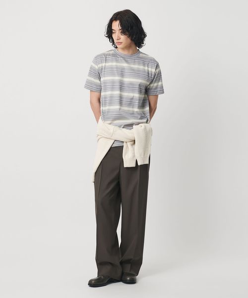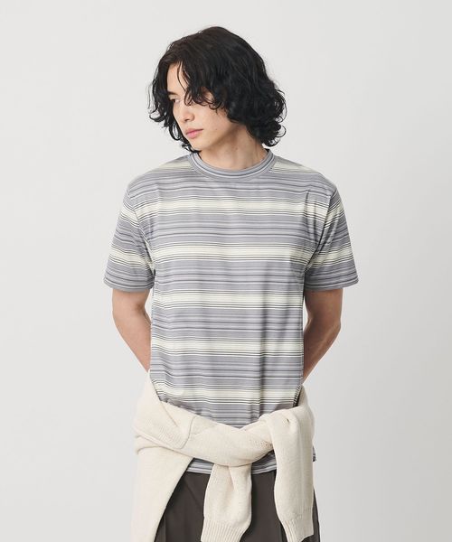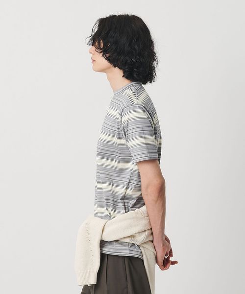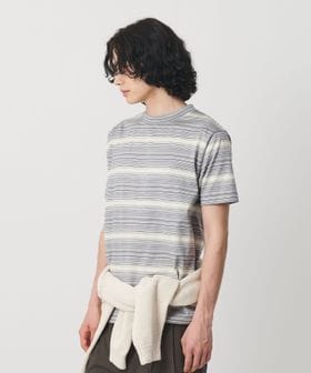 ハイゲージの上品な表情を活かした、繊細なボーダーパターンが特徴のショートスリーブカットソーです。70番手双糸の超長綿ハイゲージ天竺に、マーセライズドバイオ加工を施すことで、クリーンでほどよい光沢感のある仕上がりに。シルエットは、ややすっきりとした身幅に加えて、ボディと共地の衿&深すぎないネックラインに設定し、インナーTシャツとは異なるスマートなルックスに。ミニマルなボディバランスに、シャツ地のような薄手で張りのあるフラットな風合いが美しく調和し、洗練された大人のカジュアルスタイルを演出します。