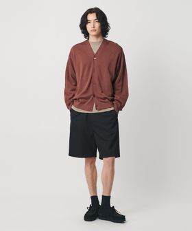釦位置を高めに設定した、狭めのVゾーンが特徴のカーディガンです。糸の段階でギマ加工を施すことにより、ドライタッチで張りのある風合いに仕上げた素材を採用しています。ボディと同色に染めたシェルボタンを添え、品のあるラグジュアリーなムードを演出。さらに着丈を短めに設定することで、一枚着として映えるスマートなデザインに。クリーンな空気感がモードな表情を薫らせ、洗練された大人のアーバンスタイルに導きます。