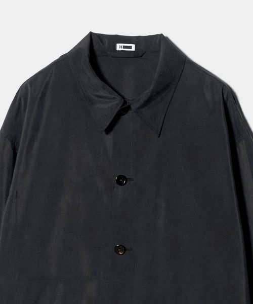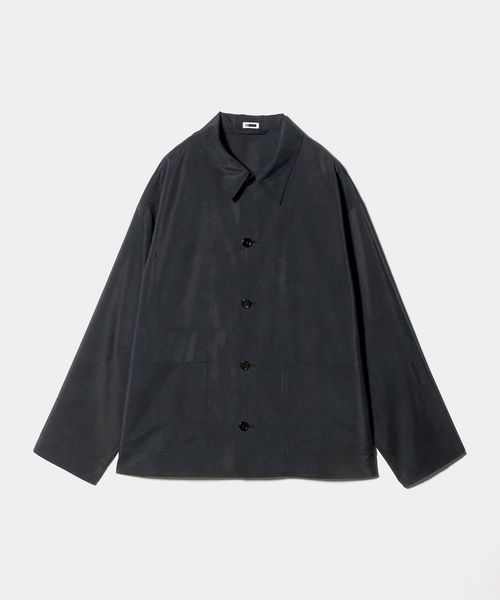 ほどよいショートレングスで仕立てたカバーオールです。シルクフィラメントとナイロンを交織した高密度タフタを使用し、仕上げに特殊加工を施しフィブリルさせることで、光沢が抑えられヴィンテージライクな掠れた雰囲気に仕上げました。上質なシルクを用いながらも、マットな風合いと適度なハリ感がカジュアルに合わせやすい一着。大きく象った直線的なパッチポケット、品のあるホーンボタンが洗練されたアーバンスタイルに導きます。