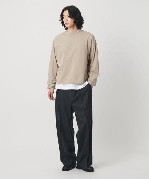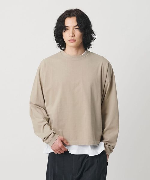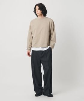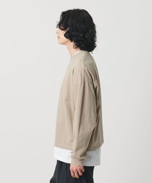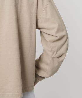 袖にタックを入れたカーブスリーブと、スエードタッチのなめらかな素材感が魅力のロングスリーブカットソーです。60番超長綿コットン糸をベースに、起毛加工(プラチナベール加工)を施したファブリックを採用。度詰めで編み立てた生地を使用し、薄手すぎない安心感のある着心地も特徴です。ボディは、ワイドな身幅に長めのスリーブ、ほどよく短めの着丈に設定し、タックイン・アウトどちらでも様になるスタイリッシュなシルエットを構築。ネックはリブではなく共地で仕立て、クリーンで洗練された表情に仕上げました。一見シンプルなTシャツでありながら、肘部分に施したタックが独特の立体感を生み、ファッションムードを高めるアクセントになっています。