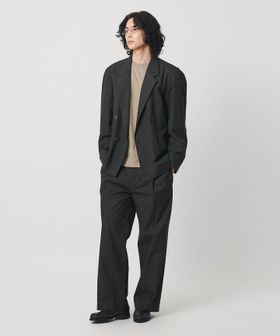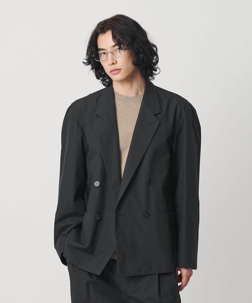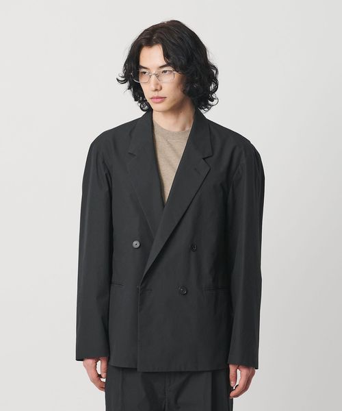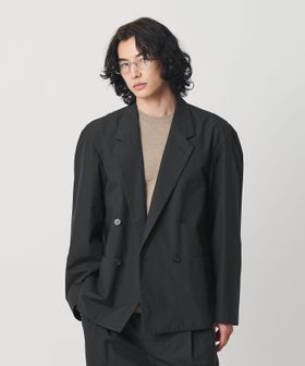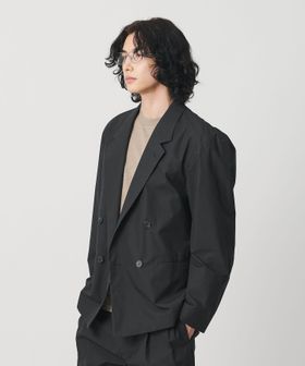 4つボタン1つ掛けのダブルブレステッドジャケットです。超長綿の糸をガス焼きで毛羽を抑え、強撚した糸を用いて高密度に織り上げたハイカウントウエザーを採用しています。仕上げ工程で表面をペーパーサンド起毛し、脱脂ニドムバイオワッシャー加工を加えることで、ヴィンテージのようなリラックス感と、上質な糸によるクリアな質感が共存した特別な生地感に仕上がりました。デザインは、胸箱ポケットを排除し、直線的でモードなバランスを強調。ウエストの絞りを抑えたボクシーシルエットに、縁の細いホーンボタンをあしらい、上品さを引き立てています。共生地のパンツ(対象品番:12211100507)とのセットアップでの着用もおすすめです。