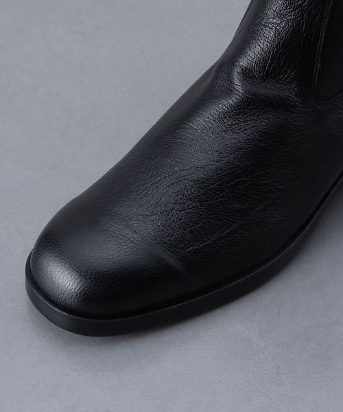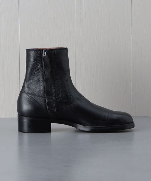 独特な艶とシボ感が印象的なゴートレザーのショートブーツです。ややスクエアのニュートラルな木型に、ウエスタンアッパーパターンを採用。内側に配したムシ隠しのファスナーが、さり気なくも上品な足元を演出します。踵をやや高く、パーツを大きく設定することで、裾幅の広いパンツとも好相性です。