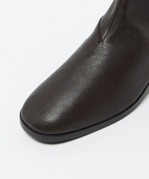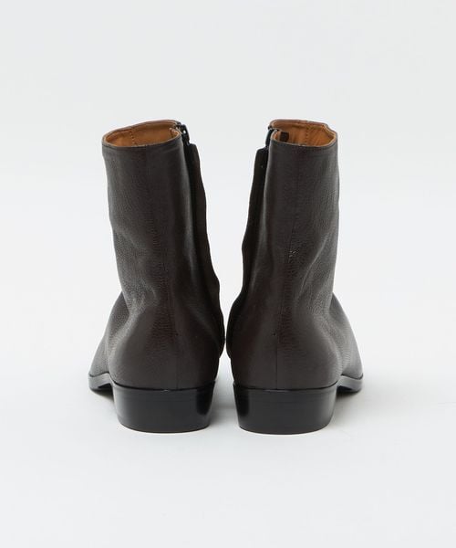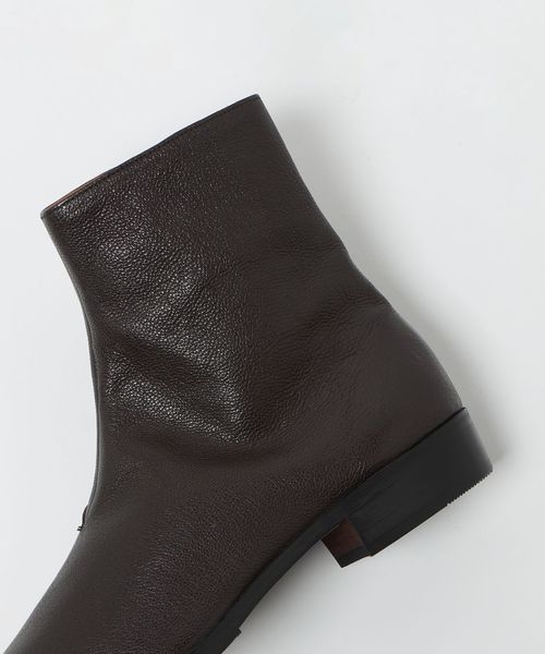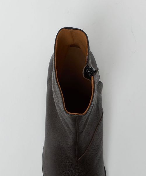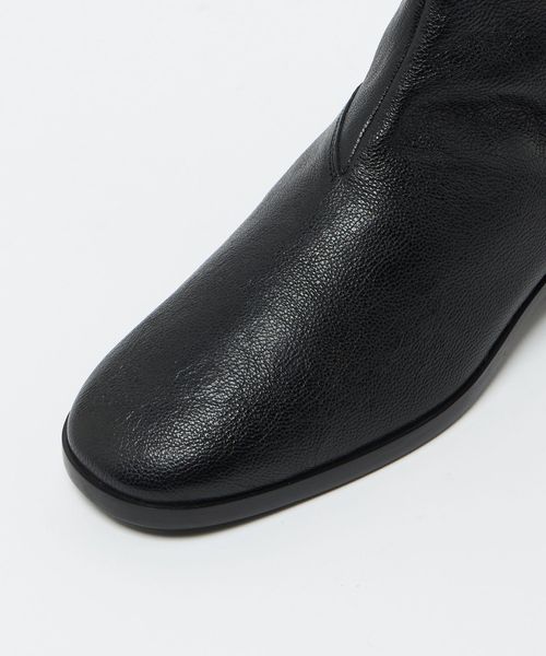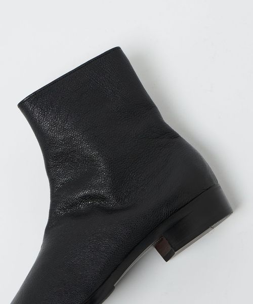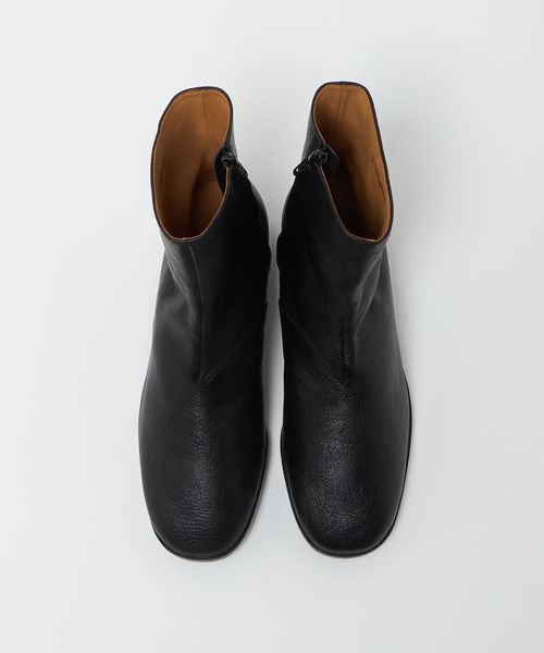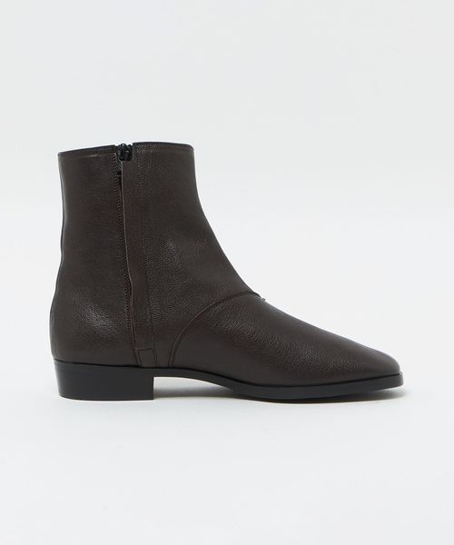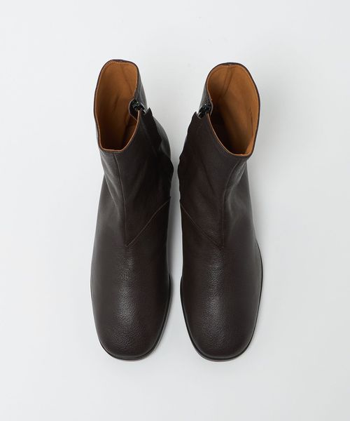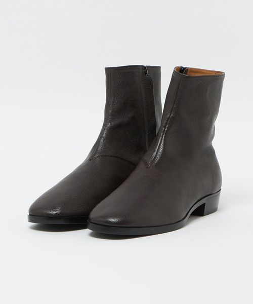 切り替えなどを極力無くし、ミニマルに仕上げたショートブーツです。アッパーには凹凸のある繊細な表面感とやわらかな質感が魅力のゴートレザーを使用しています。全体のアウトラインは丸みを持たせ、つま先はスクエアで表情をつけたデザイン。すっきりとしたコバと低めのヒールが上品な印象を与え、アウトソールは牛革と合成底を組み合わせたハイブリッド仕様。包み込むようなフィット感ではき心地もよく、日常のスタイルに洗練されたムードを添えます。
