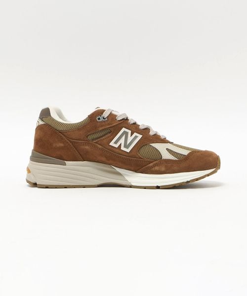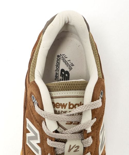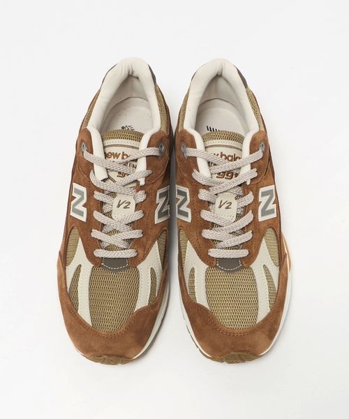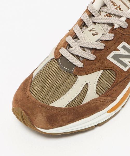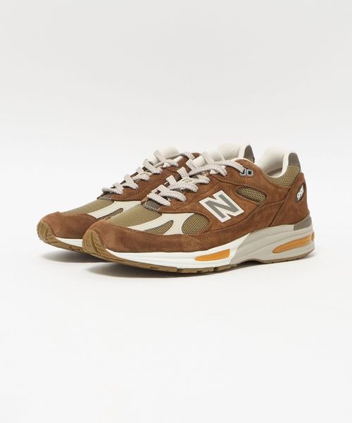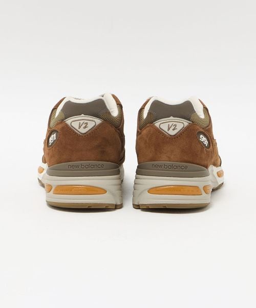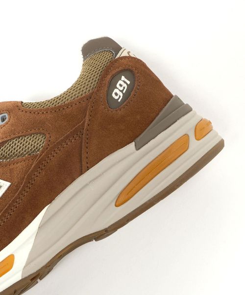 「991」のアップデートモデルとなるMade in UK「991v2」に新色が登場。象徴的なスウェード&メッシュ生地を組み合わせ、オリジナルが持つ伝統的デザインを踏襲しつつも現代的に再解釈。ヒールサイドには“991”ロゴ、ヒールの小窓には“V2”を配置。キャラメルカフェブラウンカラーの温かみのある雰囲気が目を惹く一足。