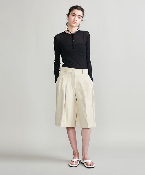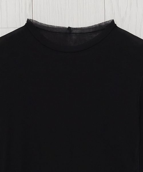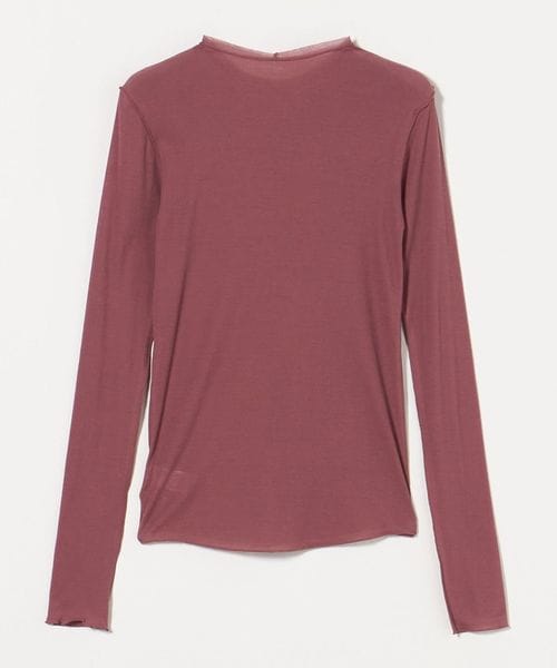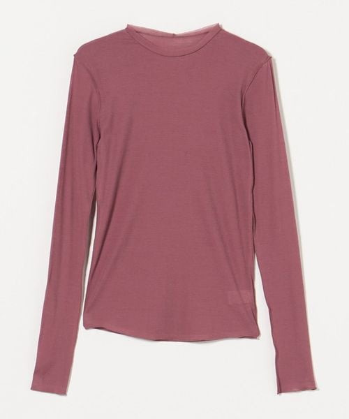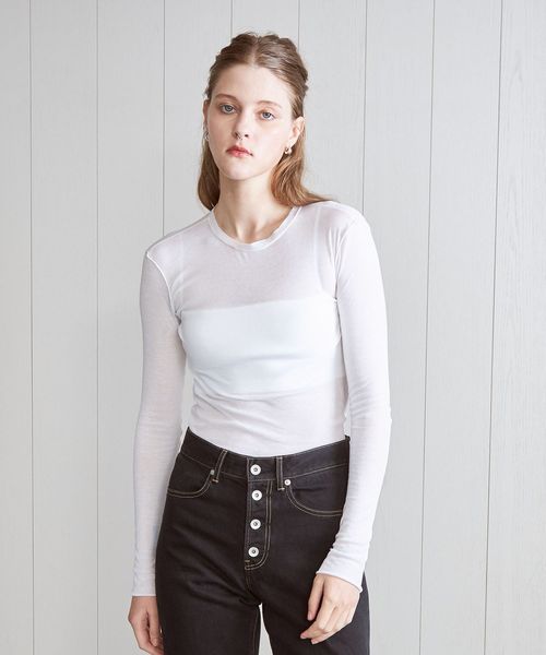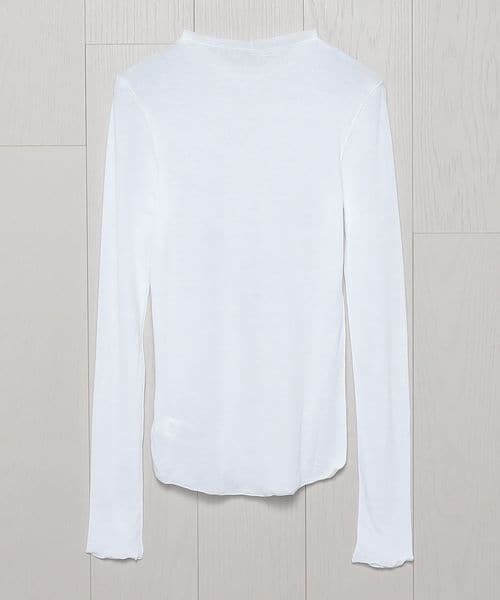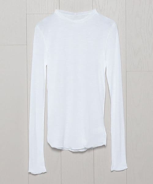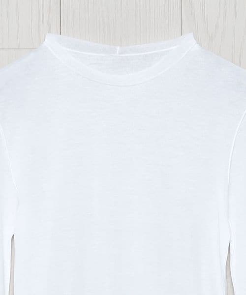 強撚のさらりとした風合いと、シアーな質感が特徴のロングスリーブカットソーです。ネックの始末や、外出しにしたメローロック仕上げの繊細な表情が、ニュアンスを生む印象的なスタイルを叶えます。シンプルながら、一枚着からインナーレイヤードまで幅広く楽しめる万能なアイテム。ほどよいフィット感がカジュアル感をおさえ、フェミニティなムードを高めてくれます。