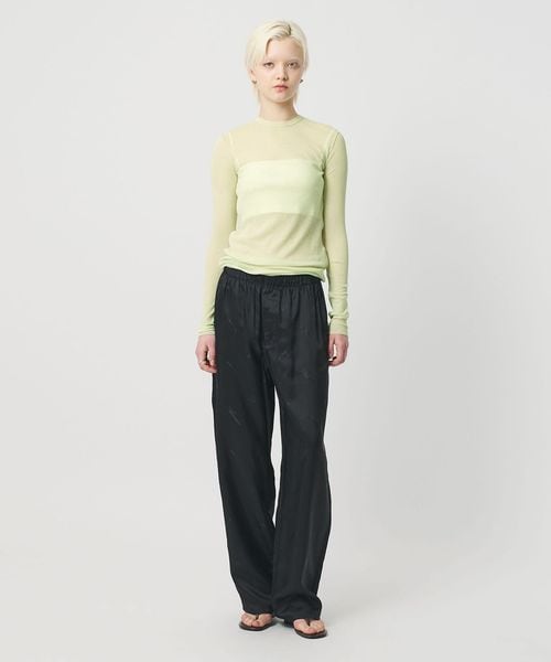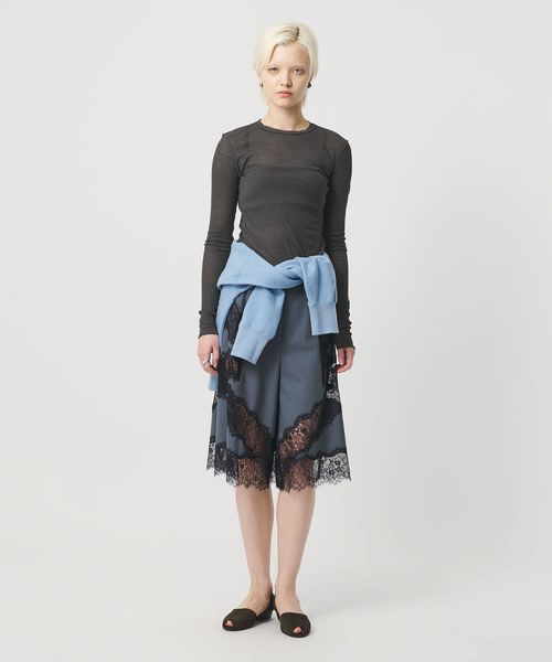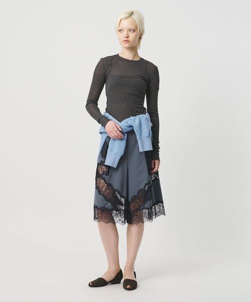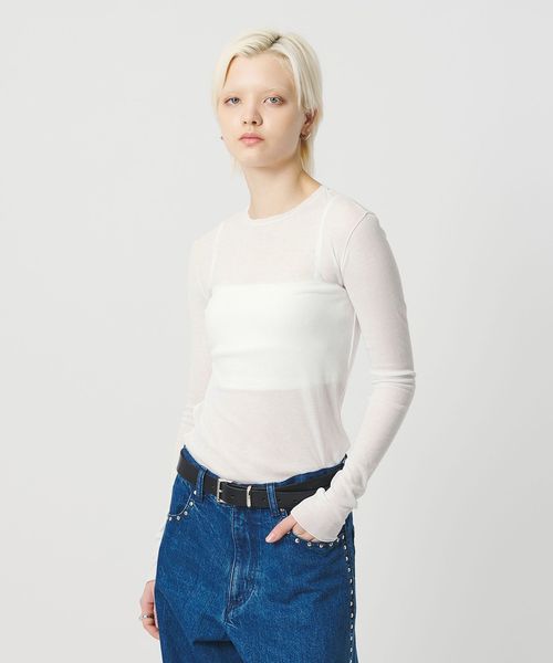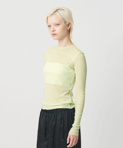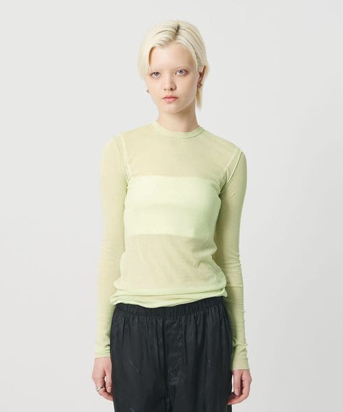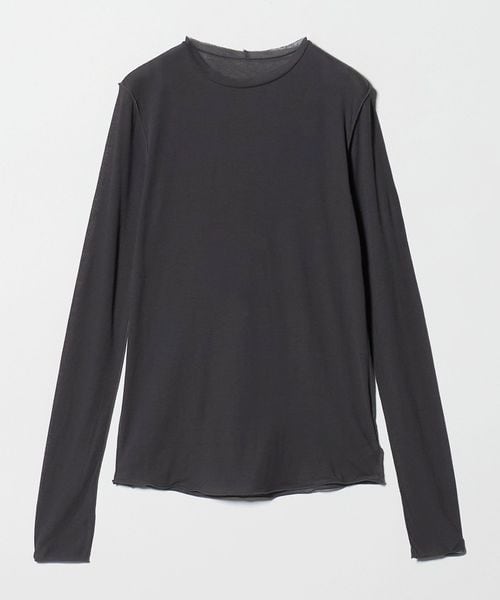 強撚のさらりとした風合いと、シアーな質感が特徴のロングスリーブカットソーです。ネックの始末や、外出しにしたメローロック仕上げの繊細な表情が、ニュアンスを生む印象的なスタイルを叶えます。シンプルながら、一枚着からインナーレイヤードまで幅広く楽しめる万能なアイテム。ほどよいフィット感がカジュアル感をおさえ、フェミニティなムードを高めてくれます。