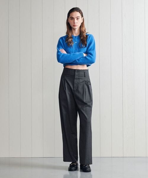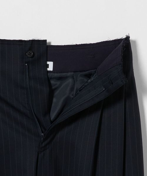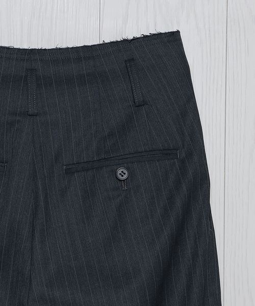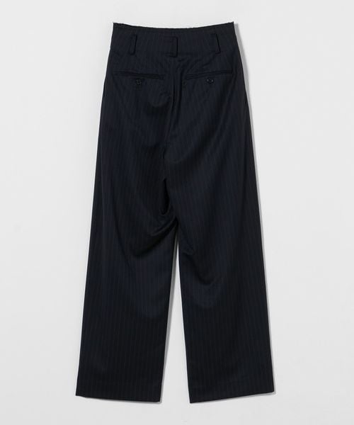 カットオフ仕立てのウエストディテールがポイントのストライプ柄タックパンツです。きれいめな表面感の生地に、2タックのマニッシュなムードが力の抜けた大人のスタイルを演出します。シンプルなカットソーやニット合わせも決まりやすく、ナチュラルな腰履きが様になる一着。さりげなくもモダンなデザインが、クラス感あふれる装いに導きます。