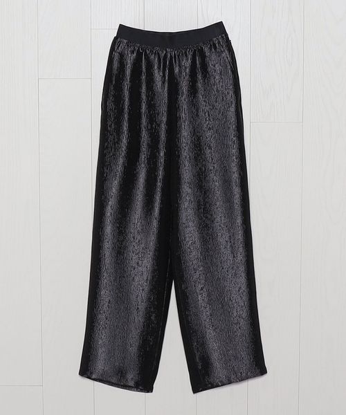 シャイニーな光沢が存在感を放つワイドパンツです。