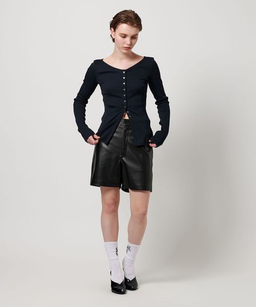 腰回りを包み込むハイウエスト型に、短めの股下丈が、シンプルながらスタイルアップと着映えが叶う一着。