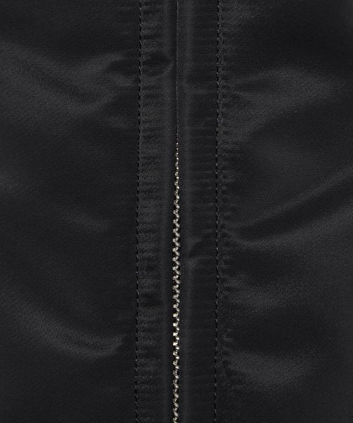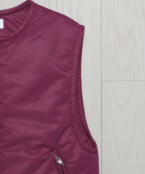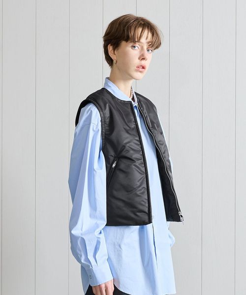 しっかりとした厚みのあるナイロンツイルのベストです。中わた入りであたたかく、MA1ライクな表情が楽しめる一着。逆開ファスナーで着こなしのアレンジができ、コンパクトなサイジングがカジュアルムードをおさえたモードな装いを叶えます。