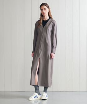 しなやかでドレープ感のあるトロピカルクロスで仕立てたマキシ丈ワンピースです。品のある生地に、シャープなフロントファスナーがエッジの効いたアクセントをプラスします。機能的なダブルジップが着こなしのアレンジを叶えながら、開けることで羽織としても楽しめるデザイン。タートルネックをインナーに添えたり、デニムやレギンスとも好相性です。すっきりとしたVネック開き、深めのスリットがシャープな雰囲気に抜け感を与え、一枚ではもちろん、さまざまなレイヤードに活躍いただけます。
