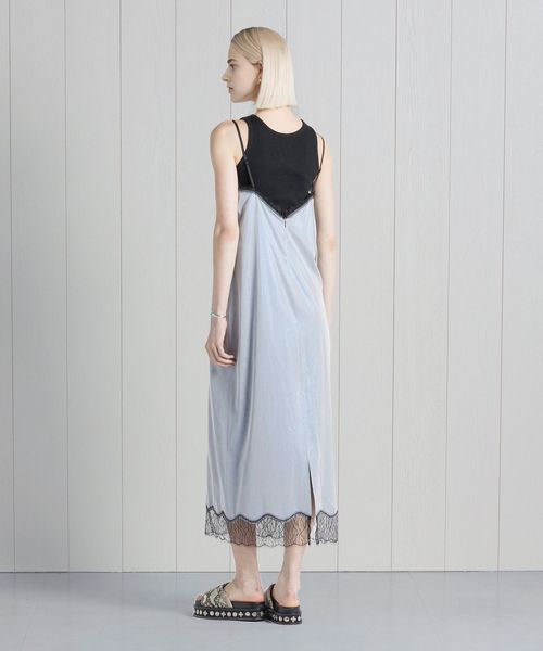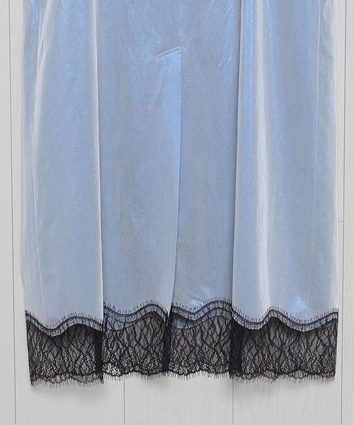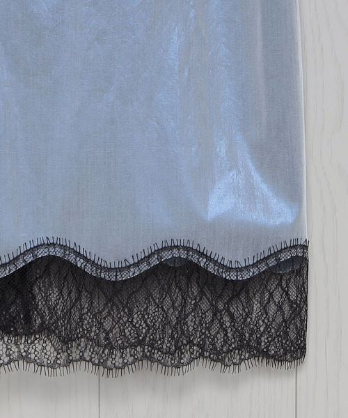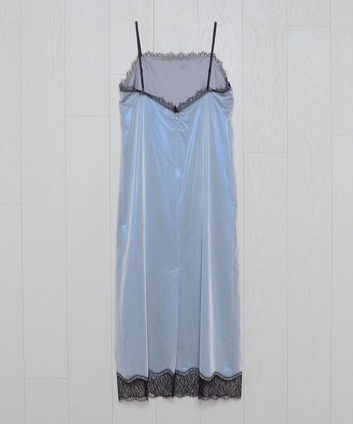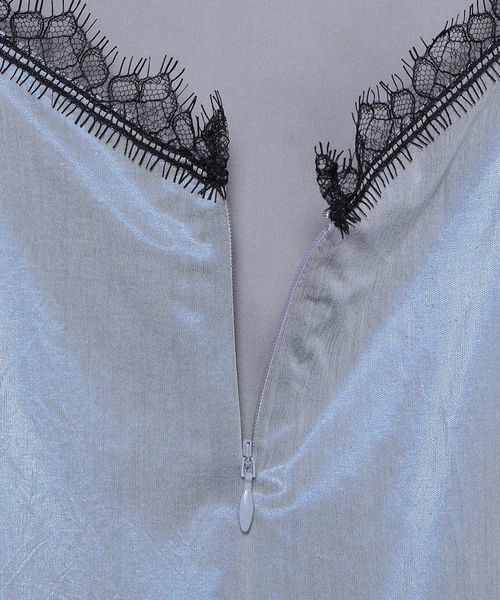 メタリックカラーと繊細なレースのドッキングデザインが特徴のワンピースです。