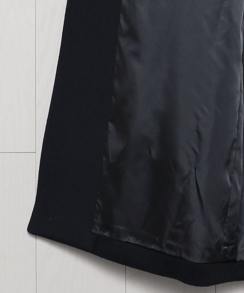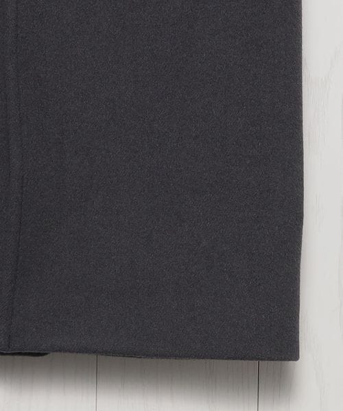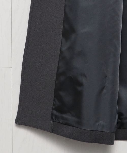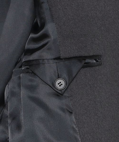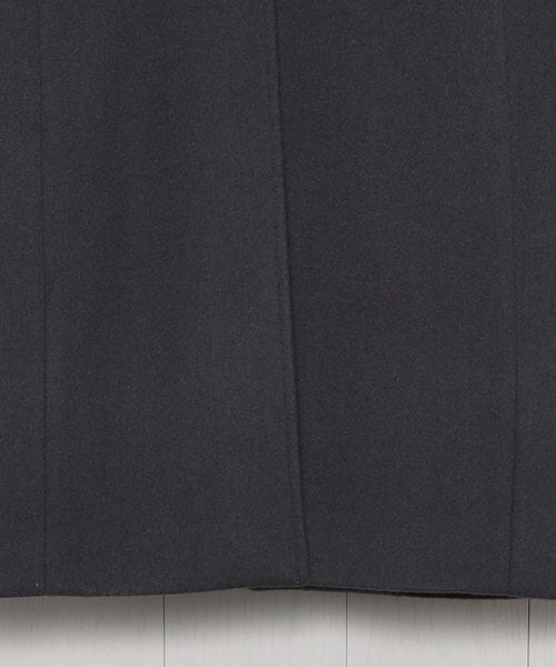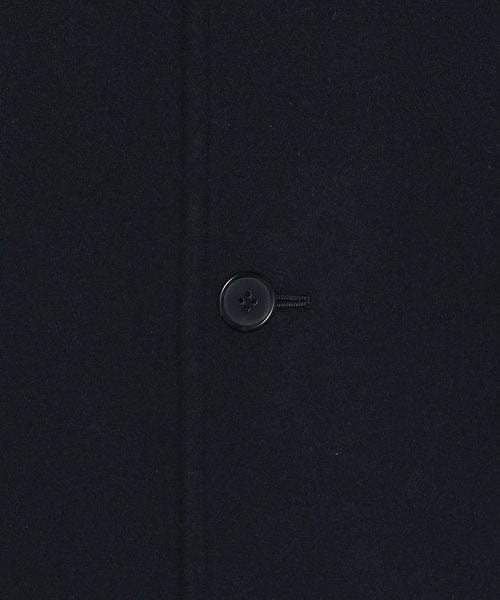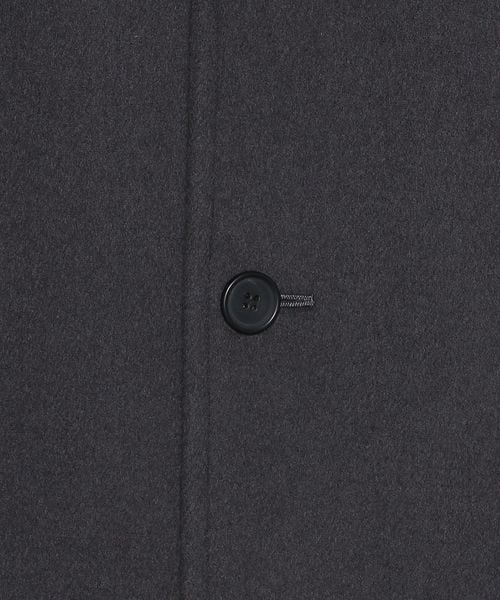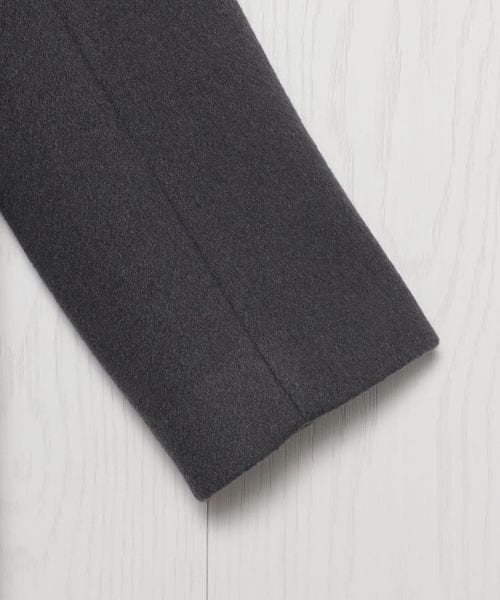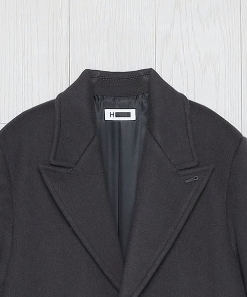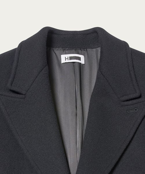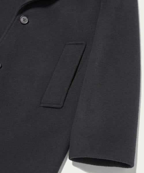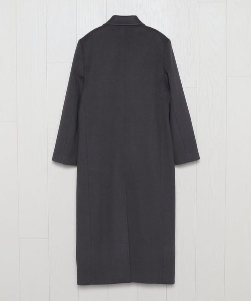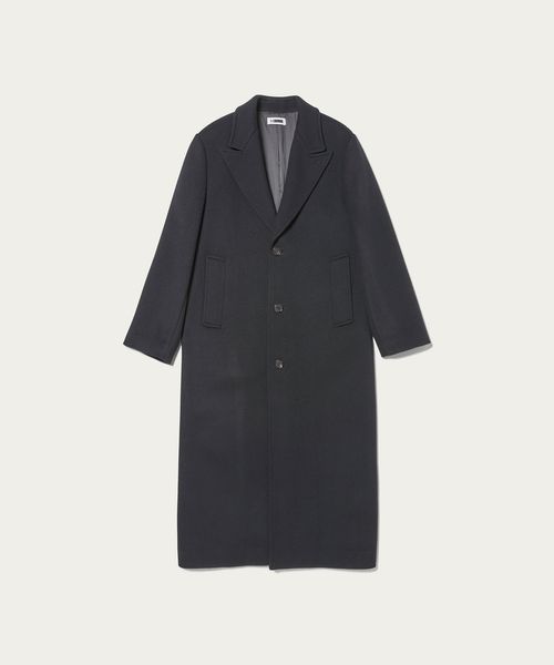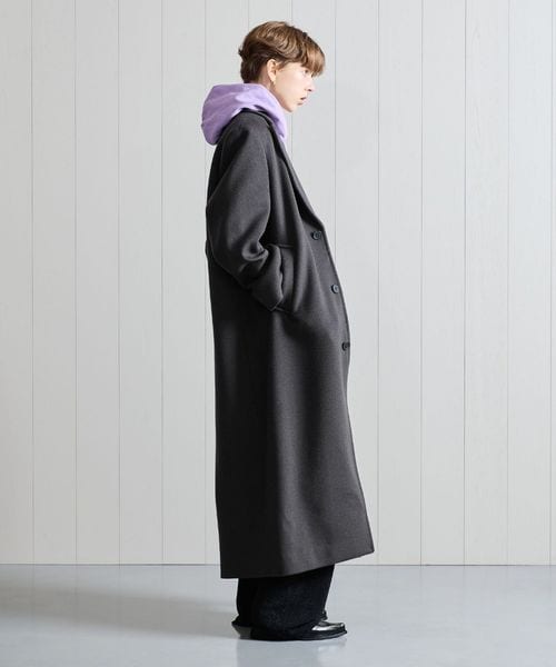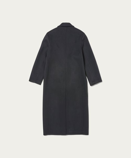 ピークドラペルのジャケットをベースに、着丈を長く仕立てたロングコートです。 シャルムビーバー加工を施し、ソフトで上品な毛並みのある素材を使用した上質感漂う一着。ボタンを外した際にフロントが隠れ過ぎないように設定した、裾に向かって細くなるシャープなシルエットもポイントです。贅沢且つスタイリッシュなスーパーロング丈が、ミニスカートやショートパンツなどのコンパクトなボトムとも相性がよく、無造作に纏うだけで印象的なアウターコーディネートに導きます。