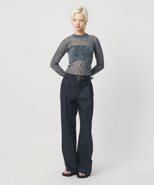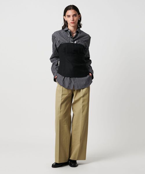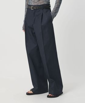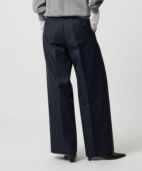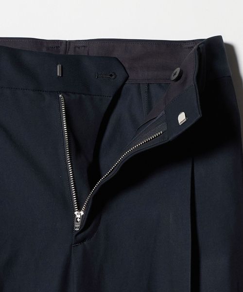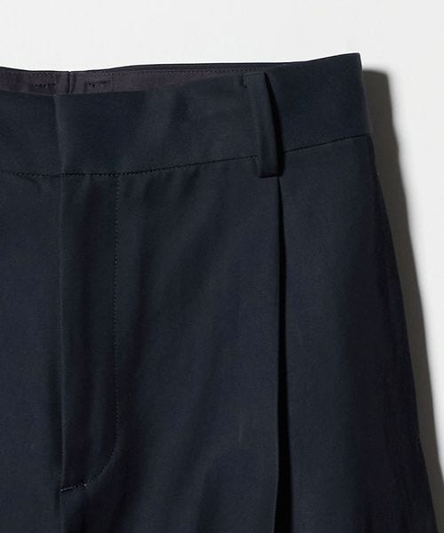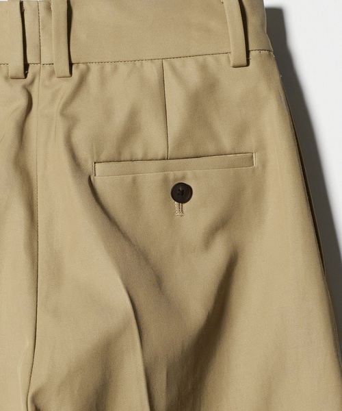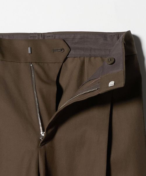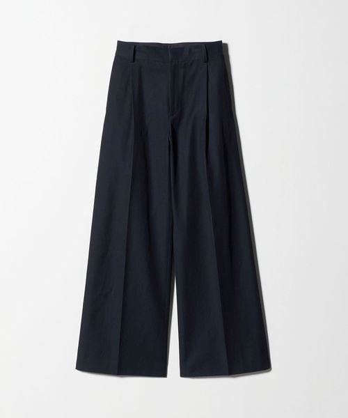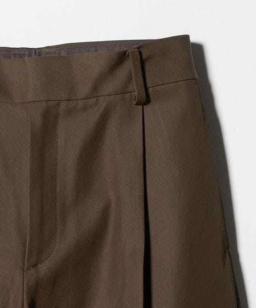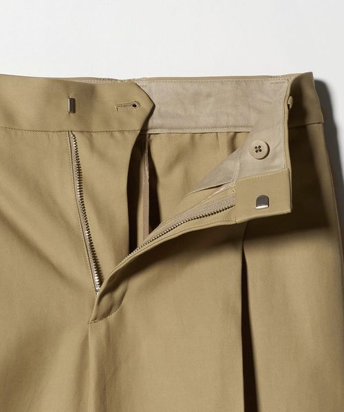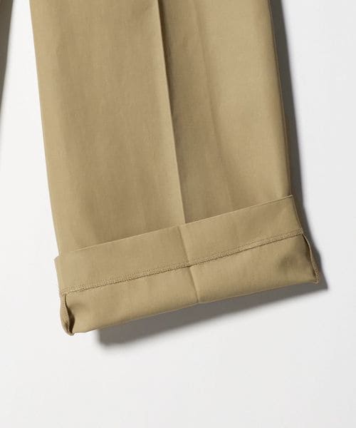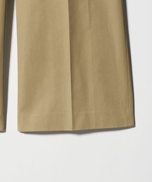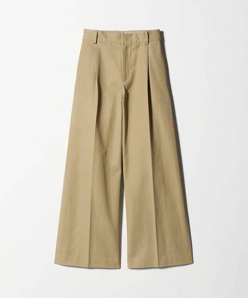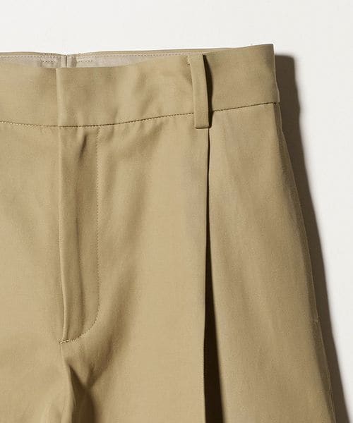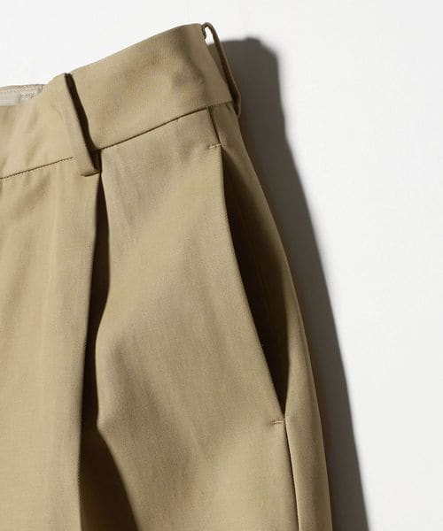 コットン/レーヨンのほどよい張り感ときれいめな綾目が特徴のワイドチノパンツです。定番モデルをサイズを1サイズ小さくリニューアルしました。動きのあるフロントタックがボリュームを生み出しながら、センタープレスの端正な表情が洗練されたカジュアルスタイルを演出。腰周りはボリュームをおさえつつ、しっかりとした太さのある綺麗なシルエットが魅力です。ヘルシーなタンクトップを添えたり、ニット合わせのミニマルな着こなしも映えるアイテム。シンプルな装いも、アーバンムード漂うクリーンなスタイルに導くおすすめの一着。