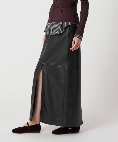 パワフルなムードを持ちあわせながら、洗練された着こなしを叶えるレザーロングスカートです。ソフトで上品な光沢のあるシープレザーを使用しています。シャープなタイトシルエットに覗く長めのスリットが、抜け感とモダンなアクセントをプラス。タイトなトップスを合わせて縦長のシルエットを強調したり、クラシックなシャツ合わせのクールな装いもおすすめです。アーバンスタイルに映える存在感で、コーディネートの主役にもなるアイコニックな一着。