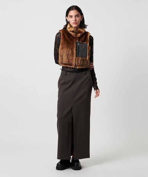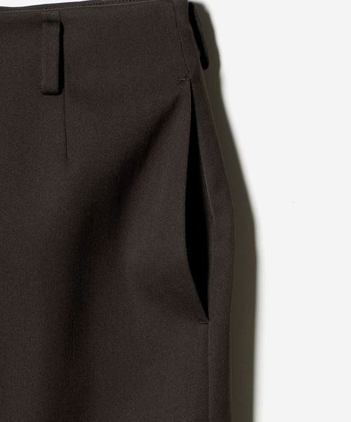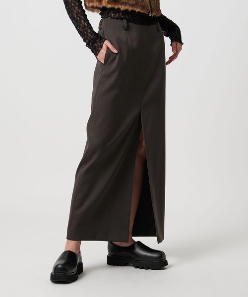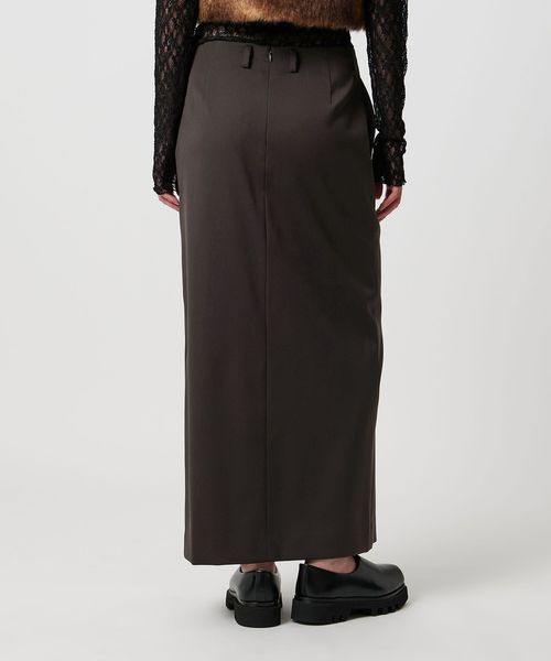 深めに入ったフロントベンツが印象的なタイトマキシスカートです。クリアな表面感のポリエステル/ウールのダブルクロスを使用し、しっかりした肉感ながら軽さと膨らみのある風合いが特徴です。バックファスナー仕様、スリットポケットを配したミニマルなディテールが、洗練された大人のフェミニティを演出。コンパクトなトップス合わせや、ウエストインでベルトマークしたクラシックな着こなしもおすすめです。エッジを覗かせつつも静かなシルエットがモダンな雰囲気を与え、カジュアルからモードまでさまざまなスタイルに寄り添います。
