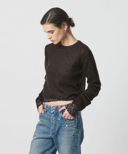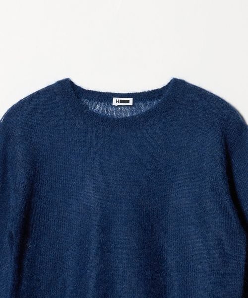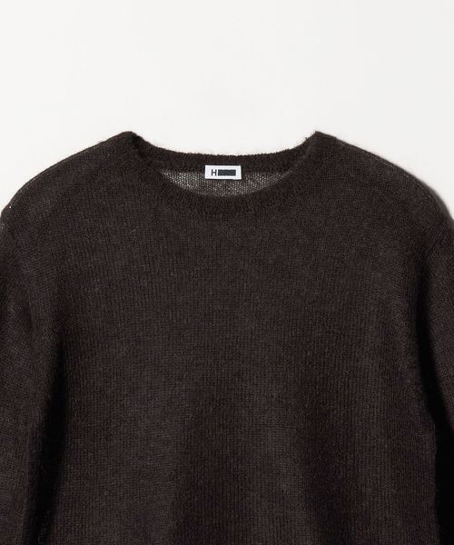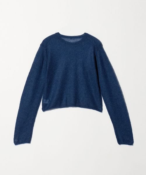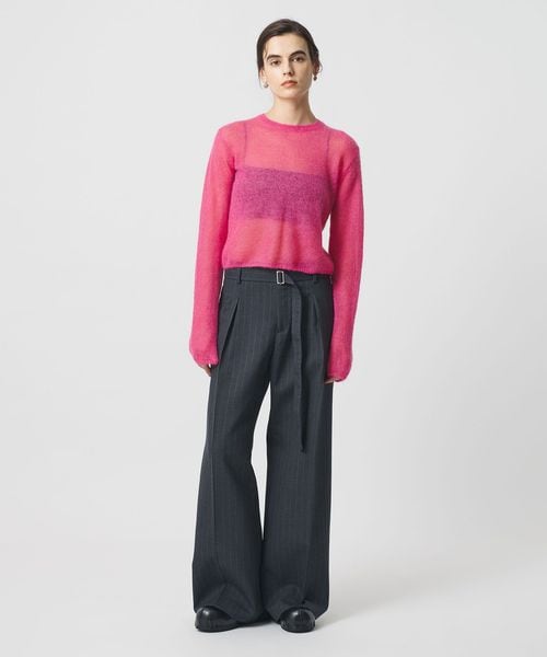 モヘヤの毛足感とシアーな表情を持ちあわせたニットプルオーバーです。ゆとりのある身幅に、長めのスリーブ、すっきりとした着丈が特徴の豊かなボディバランス。メリハリのあるシルエットが着映えを叶えながら、美しい発色と奥行を生む透け感がファッションムードを高めてくれます。カットソーをレイヤードしてニュアンスを楽しんだり、ハードなレザーボトムとも好相性。自由な装いで、日常のスタイルに華を添えるマルチな一着。