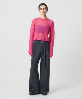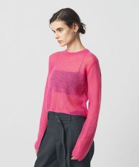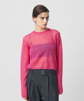 モヘヤの毛足感とシアーな表情を持ちあわせたニットプルオーバーです。ゆとりのある身幅に、長めのスリーブ、すっきりとした着丈が特徴の豊かなボディバランス。メリハリのあるシルエットが着映えを叶えながら、美しい発色と奥行を生む透け感がファッションムードを高めてくれます。カットソーをレイヤードしてニュアンスを楽しんだり、ハードなレザーボトムとも好相性。自由な装いで、日常のスタイルに華を添えるマルチな一着。