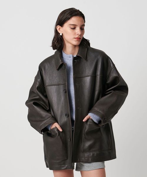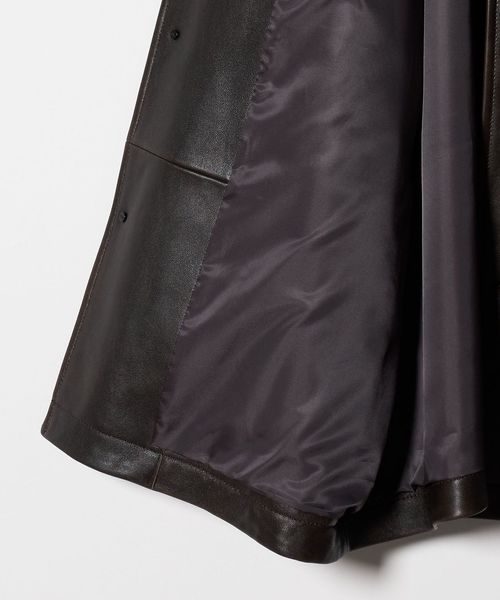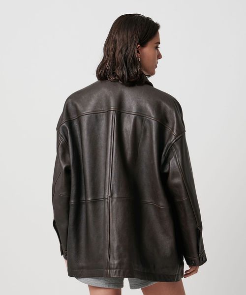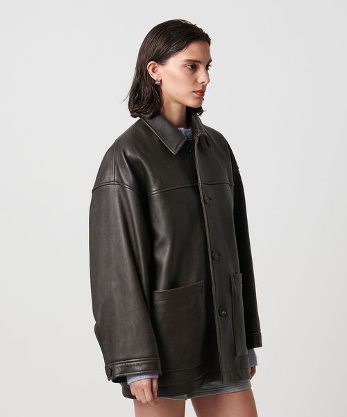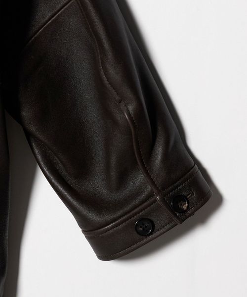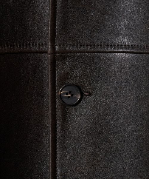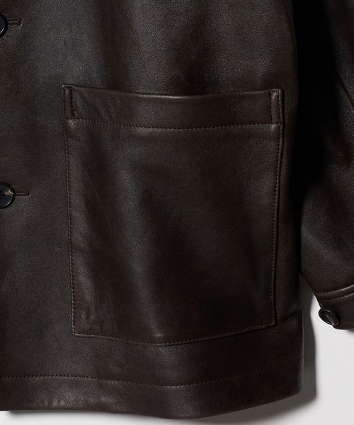 ヴィンテージ調の趣のある表情が印象的な、シープスキンのボストンレザーで仕立てたカバーオールです。染色後ブラックの染料顔料を吹き付け、 熱をかけながら揉むことで表面のムラ感を出したレザーを使用しています。加工感のあるカジュアルなフィーリングがほどよい抜け感を与え、自由で飾らないアーバンスタイルへと導きます。