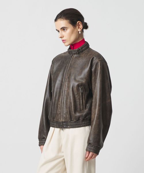 ヴィンテージ調の趣のある表情が印象的な、シングルライダースディテールのブルゾンです。染色後ブラックの染料顔料を吹き付け、 熱をかけながら揉むことで表面のムラ感を出した、シープスキンのボストンレザーを使用しています。裾や袖口は、ニットリブではなく共革のシャーリングで仕立てた品のある仕上がり。軽快なショートレングスが、さまざまなボトムと相性がよく、カジュアルにもモードにも寄り添う一着。加工感のある表情がほどよい抜け感を与え、自由で飾らないアーバンスタイルへと導きます。