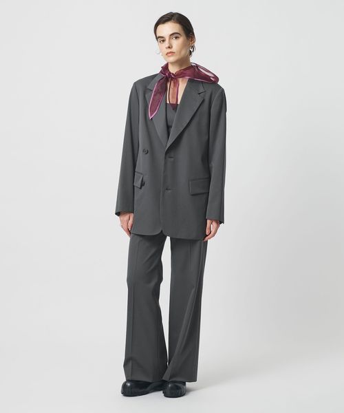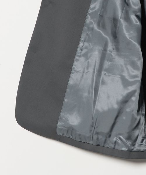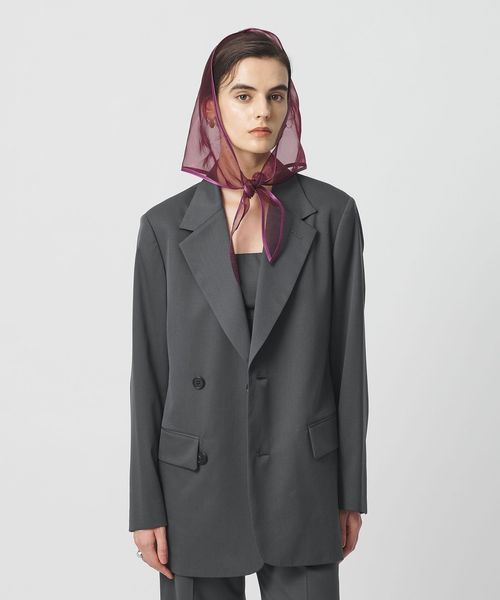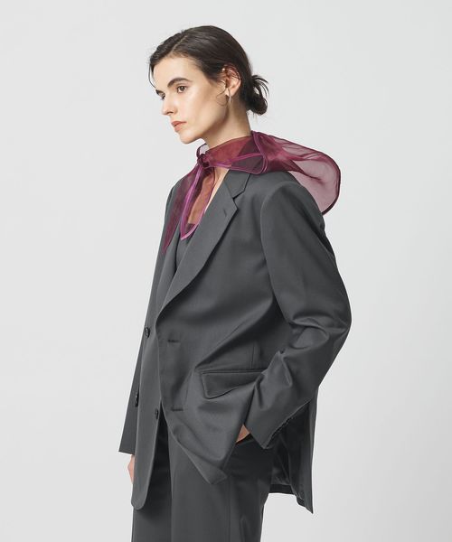 オーバーサイズのボクシーシルエットが特徴のテーラードジャケットです。薄手ながらハリがあり、きれいな表面感のツイルを使用しています。ダブルブレスト風にボタンを付け、留め方によってシルエットを変えて着用が可能。内側のストラップをわざと見せて着るのもおすすめです。同シリーズのビスチェやパンツを合わせたセットアップや、ミニ丈のボトムを添えたシンプルな装いも様になる一着。端正な表情が特徴的なディテールを引き立て、さりげなくもモダンな存在感を発揮します。