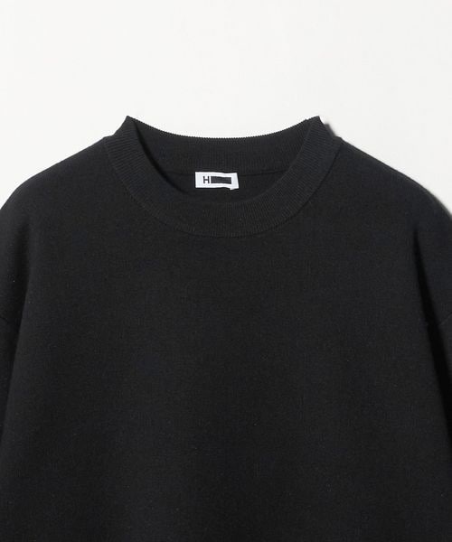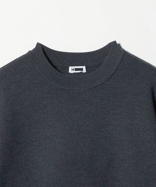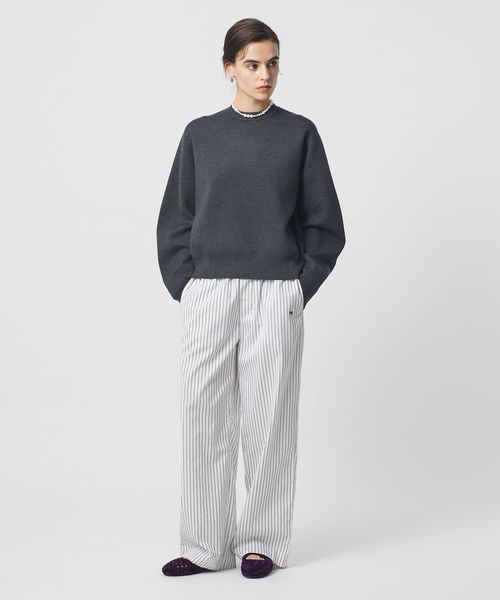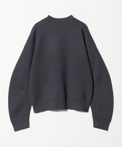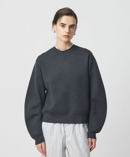 立体感のあるカーブスリーブがモダンなムードを運ぶ、ニットプルオーバーです。ウール/ポリエステルの糸をスムース組織にした張りのある肉感が、特徴的なフォルムを美しく際立たせています。カジュアルからきれいめまで合わせるボトムを選ばず、同シリーズのパンツとのセットアップもおすすめです。アーバンムード漂う存在感で、シンプルな装いも印象的なスタイルに導きます。